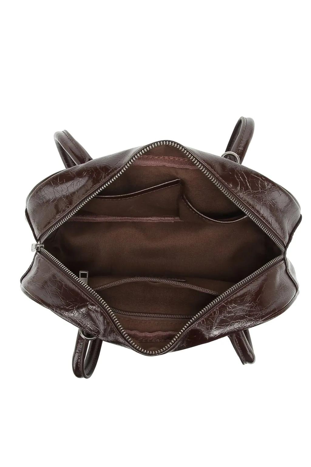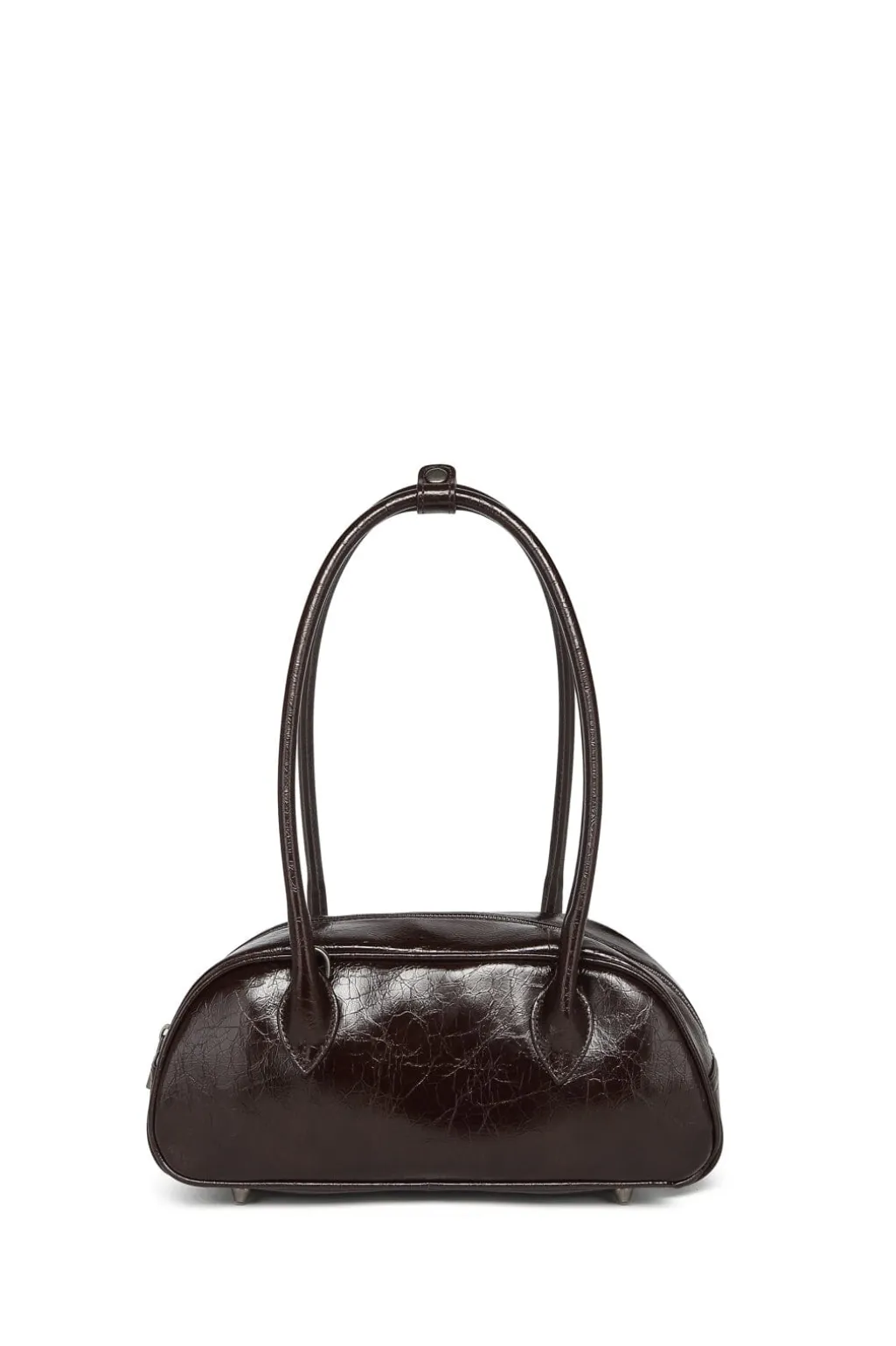En lille bowlingtaske fra Noella i en brun nuance. Tasken har et distressed læderlook med en skinnende overflade og to lange håndtag.