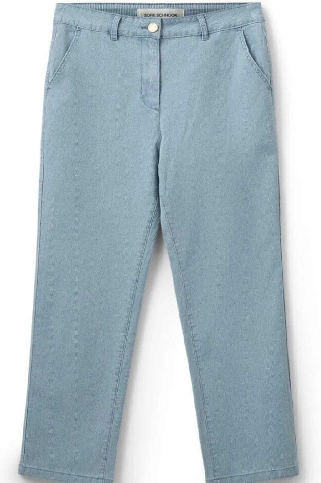 Stribede bukser fra Sofie Schnoor i lyseblå. Bukserne har broderidetaljer og går til anklen. Lukningen består af både lynlås og knapper.
