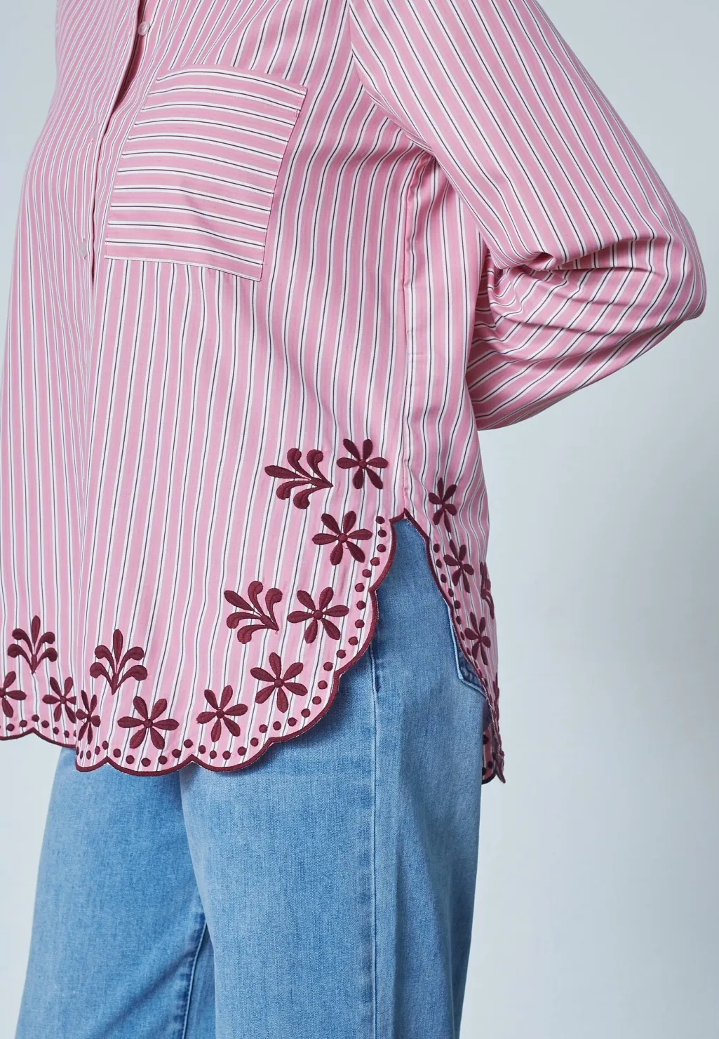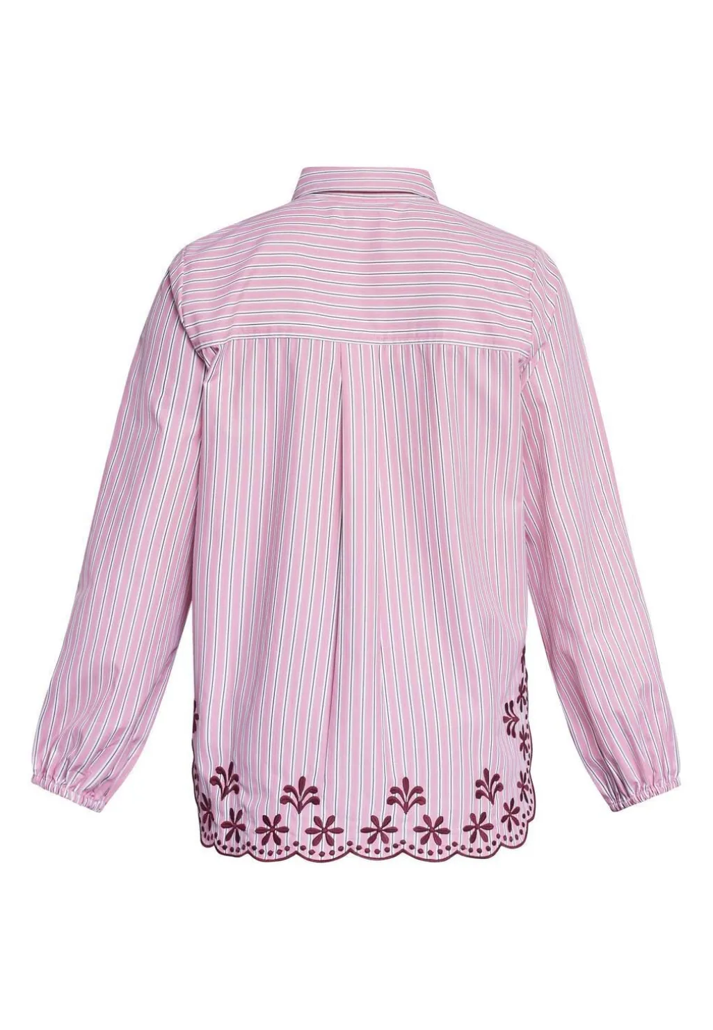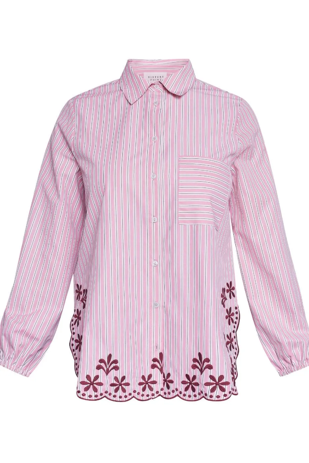 Stribet skjorte fra Sisters Point i pink med hvide striber og bordeaux detaljer. Skjorten har en løs pasform og er lavet af 75 % polyester og 25 % bomuld.