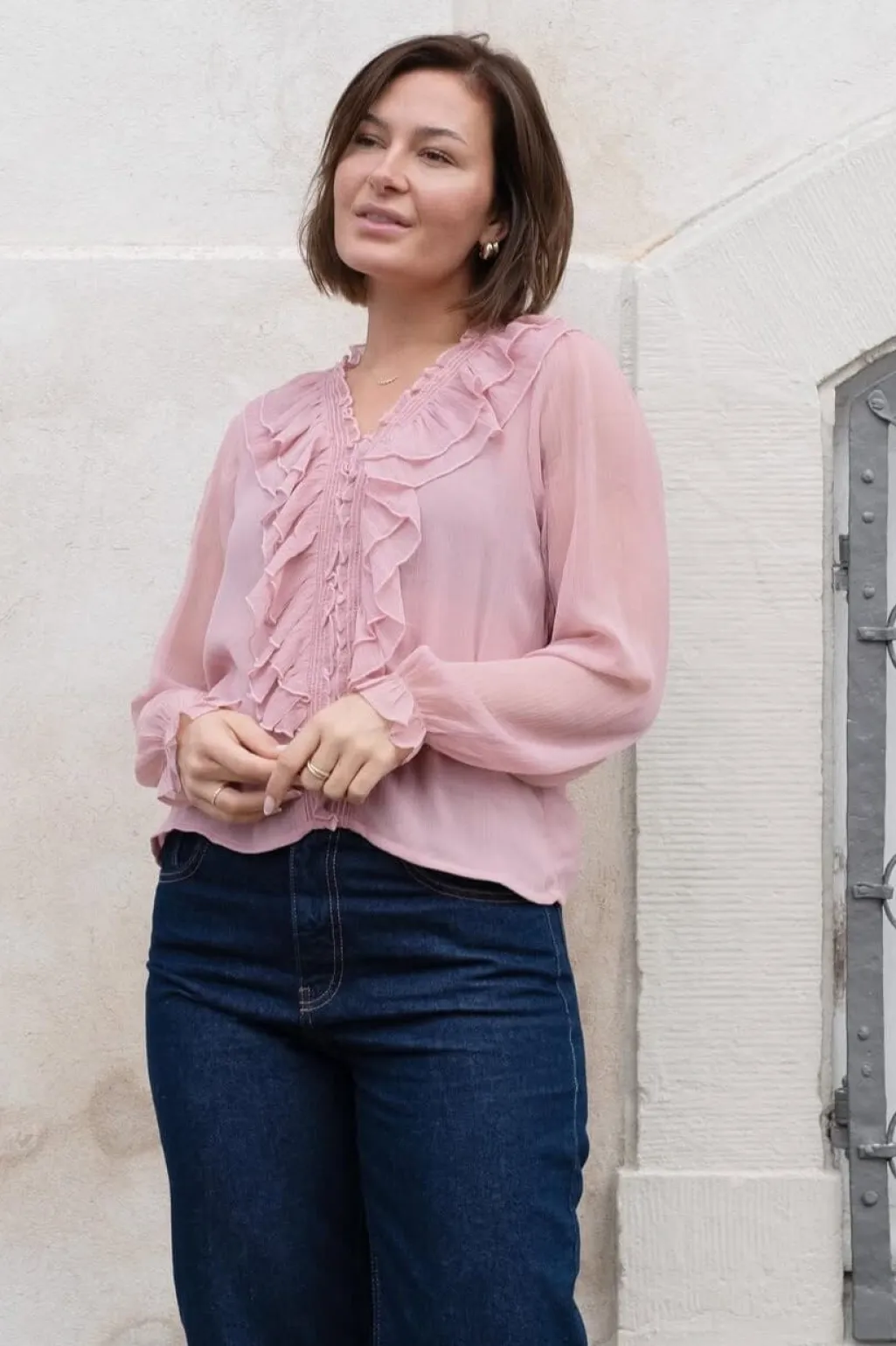 Rosa bluse fra Neo Noir med flæser og smockdetaljer. Blusen har V-hals, knapper foran og lange ærmer med rynkede manchetter. Den bløde chiffon giver et let fald.