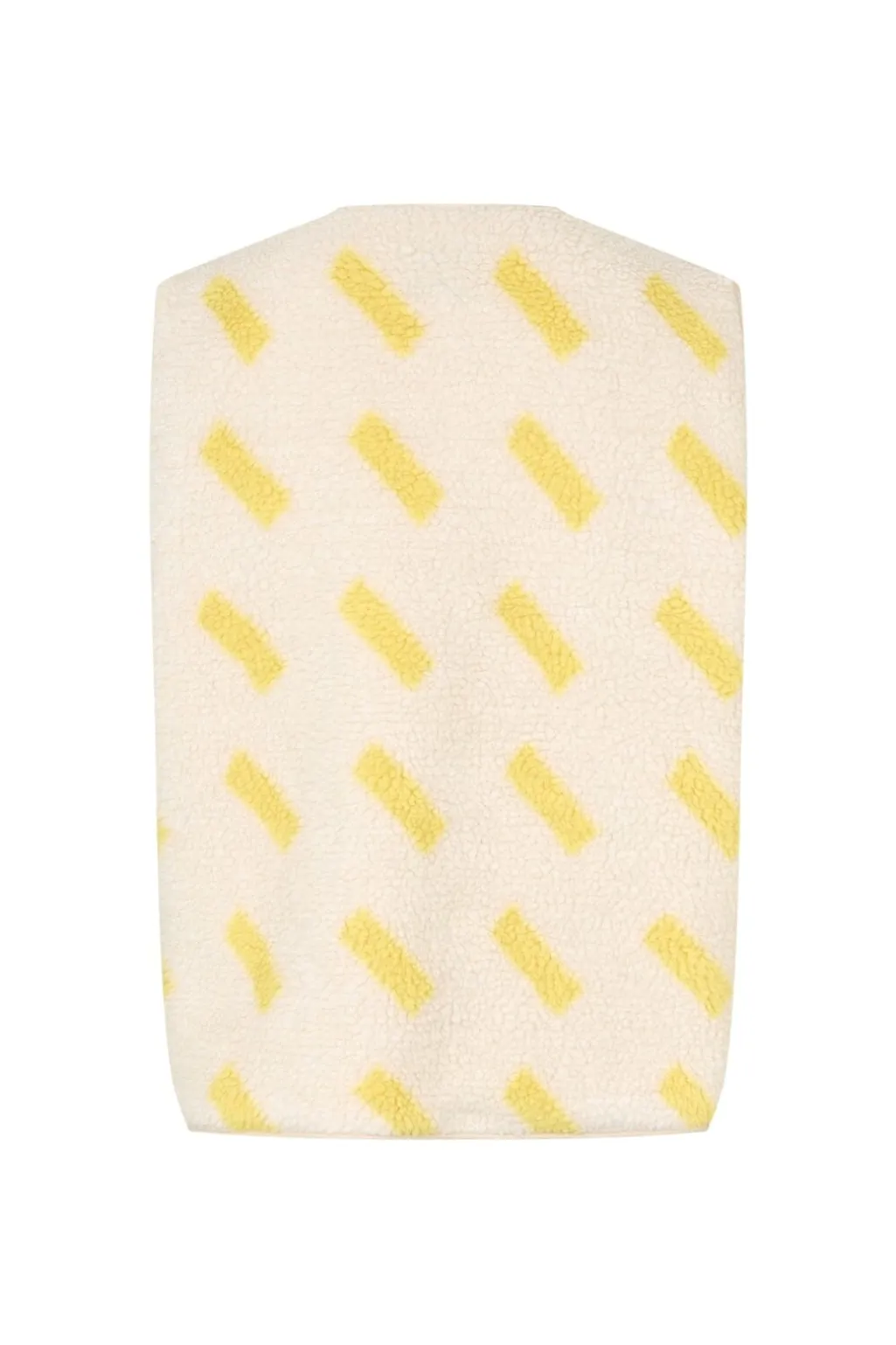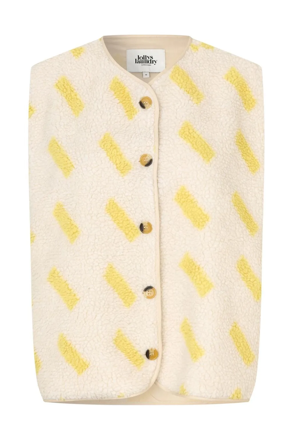 Ærmeløs vest fra Lollys Laundry med et geometrisk mønster af gule rektangler på cremebaggrund. Den har rund halsudskæring og knapper foran.