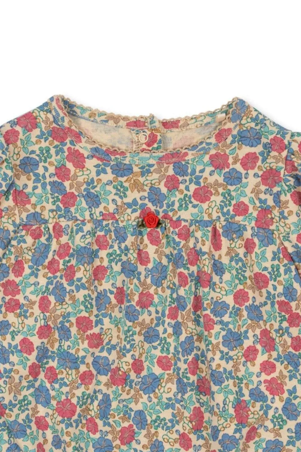 En romper fra Konges Sløjd med korte ærmer og rund halsudskæring. Stoffet har et blomstermønster i røde og blå nuancer på lys bund, og romperen har flæsedetaljer samt knaplukning.