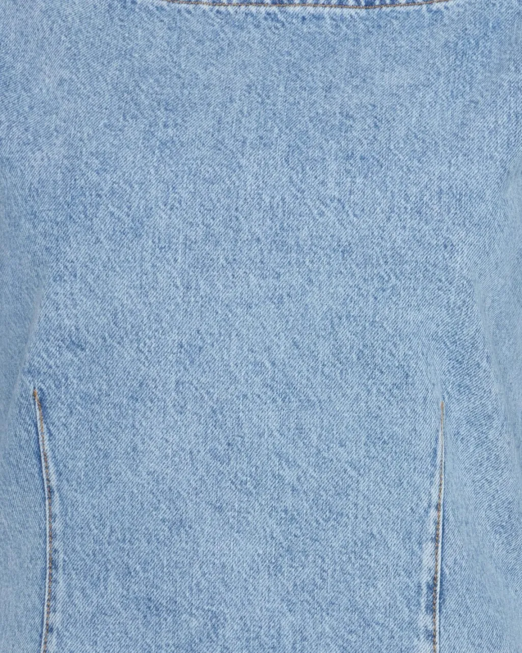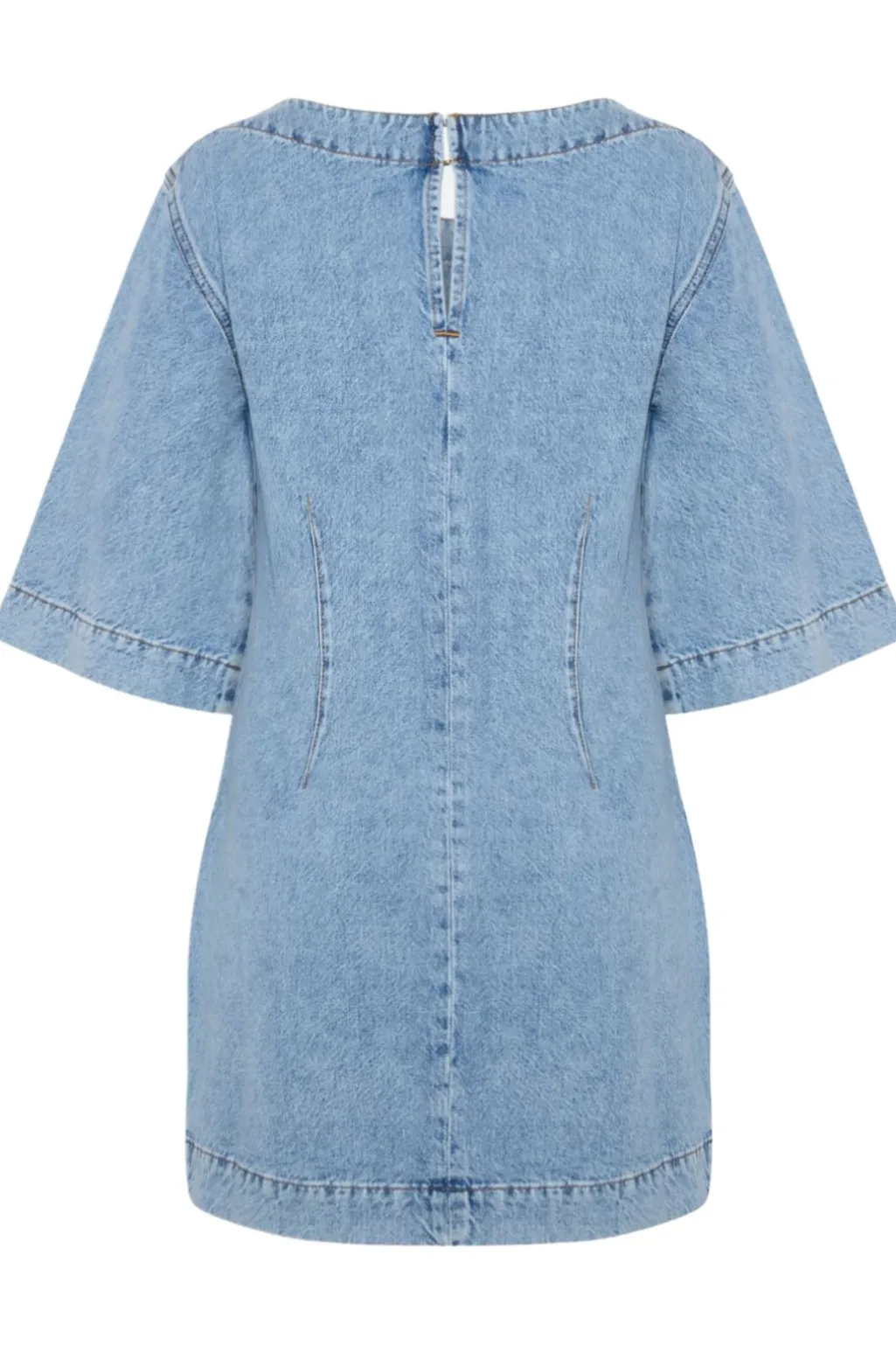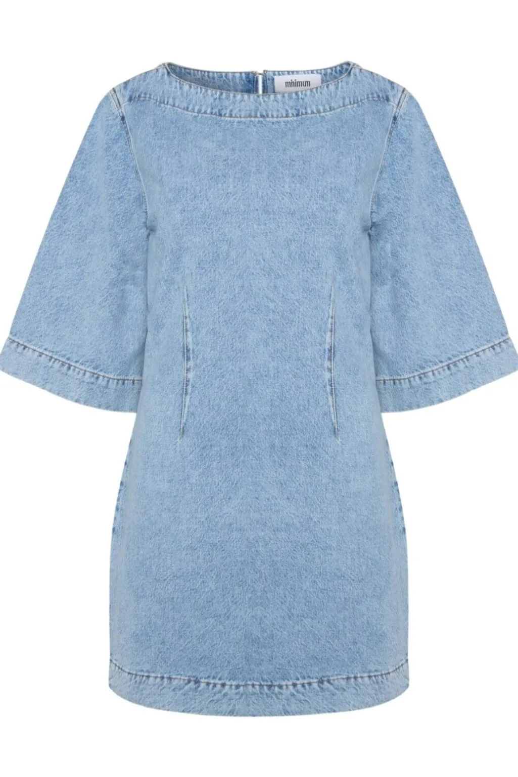 Lys blå denimkjole fra Moves By Minimum med lodrette sømme og lynlås i ryggen. De korte klokkeærmer og den runde halsudskæring giver kjolen et rent design.