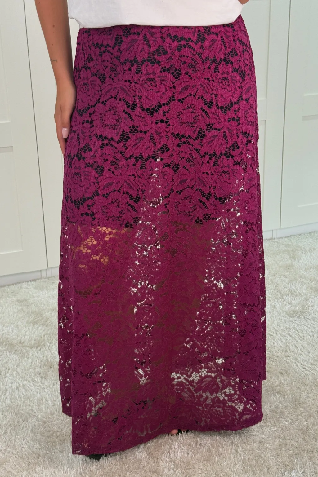 Lilla nederdel fra A-bee med blomstret blonde. Nederdelen har en normal talje og går ned til anklerne.