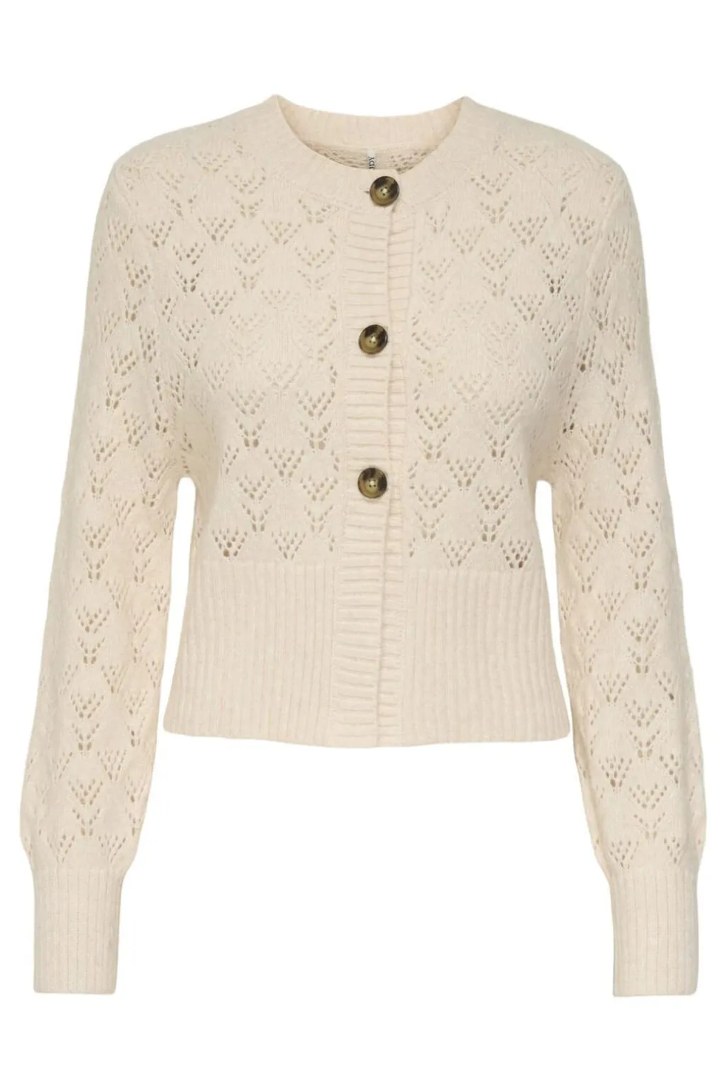 Strikket cardigan fra JDY i en lys cremefarvet nuance. Cardiganen har dekorative syninger, der giver et detaljeret udtryk.