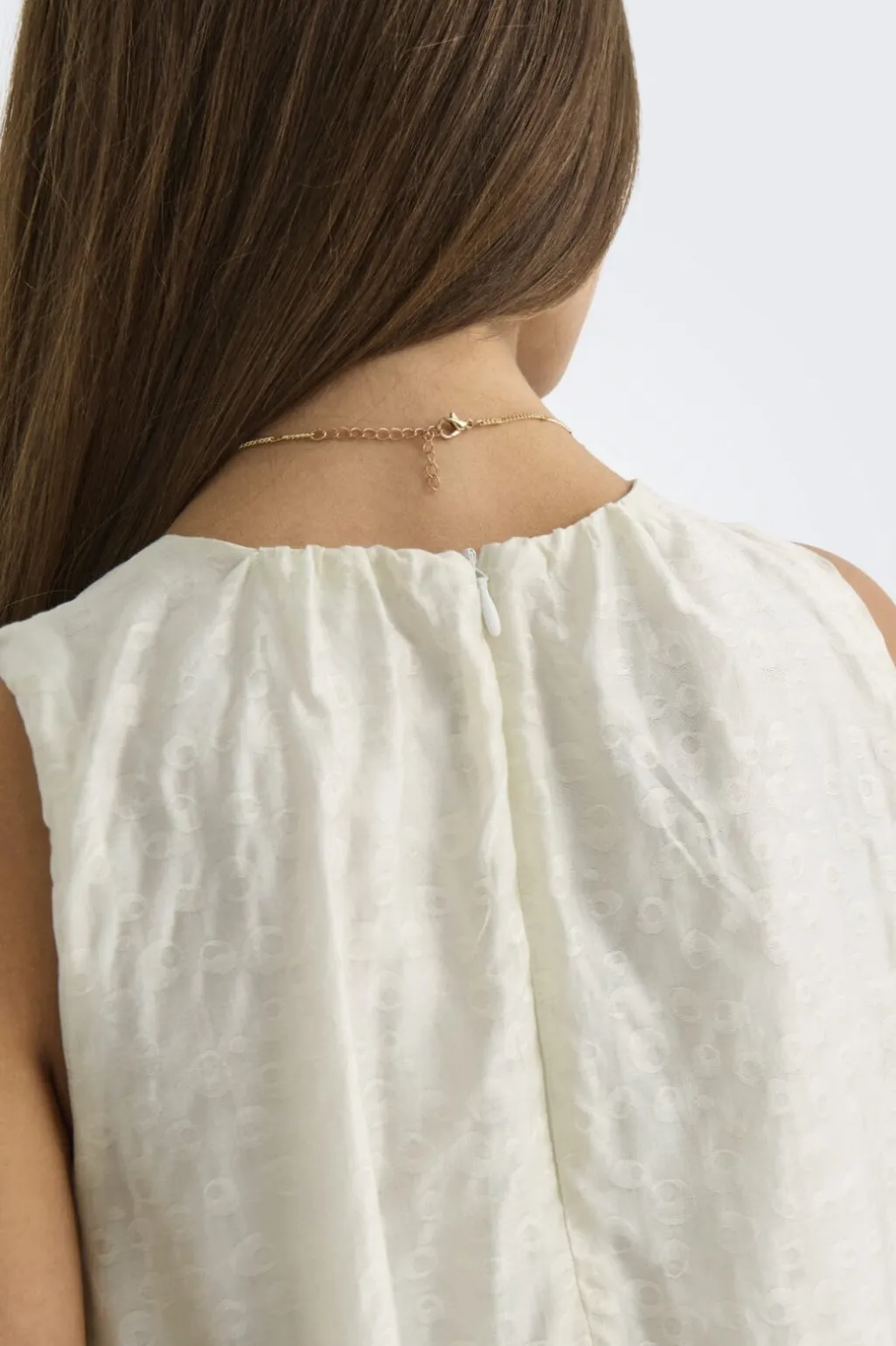 Ærmeløs kjole fra JDY i birkefarvet stof med rund halsudskæring. Kjolen har en regular fit og et karakteristisk bubble hem-design med lynlås på ryggen.