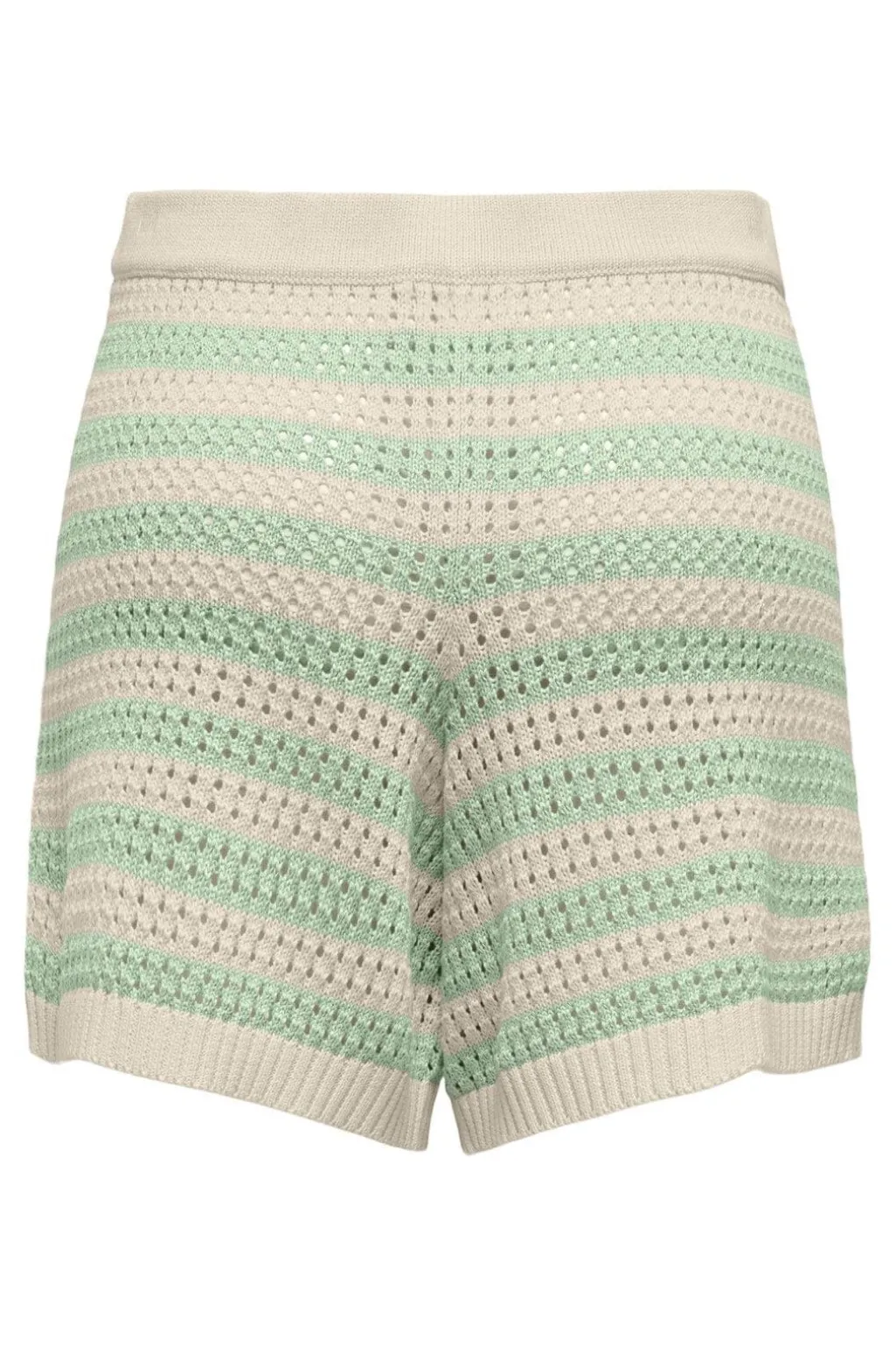 Strikkede shorts fra JDY med striber i beige og mintgrøn. Shortsene har et luftigt hulmønster og en elastisk linning i taljen. Regular fit-pasform med lårkorte ben.
