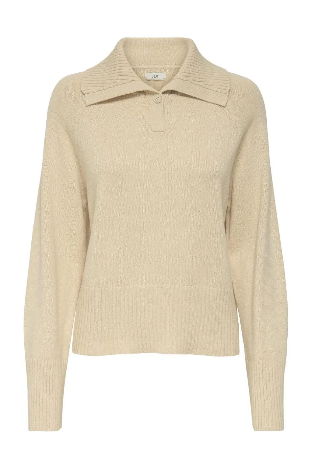 Beige strikket pullover fra JDY med polo-krave og knapper. Trøjen har lange ærmer, ribstrikkede kanter og et ensfarvet design i en neutral beige nuance.