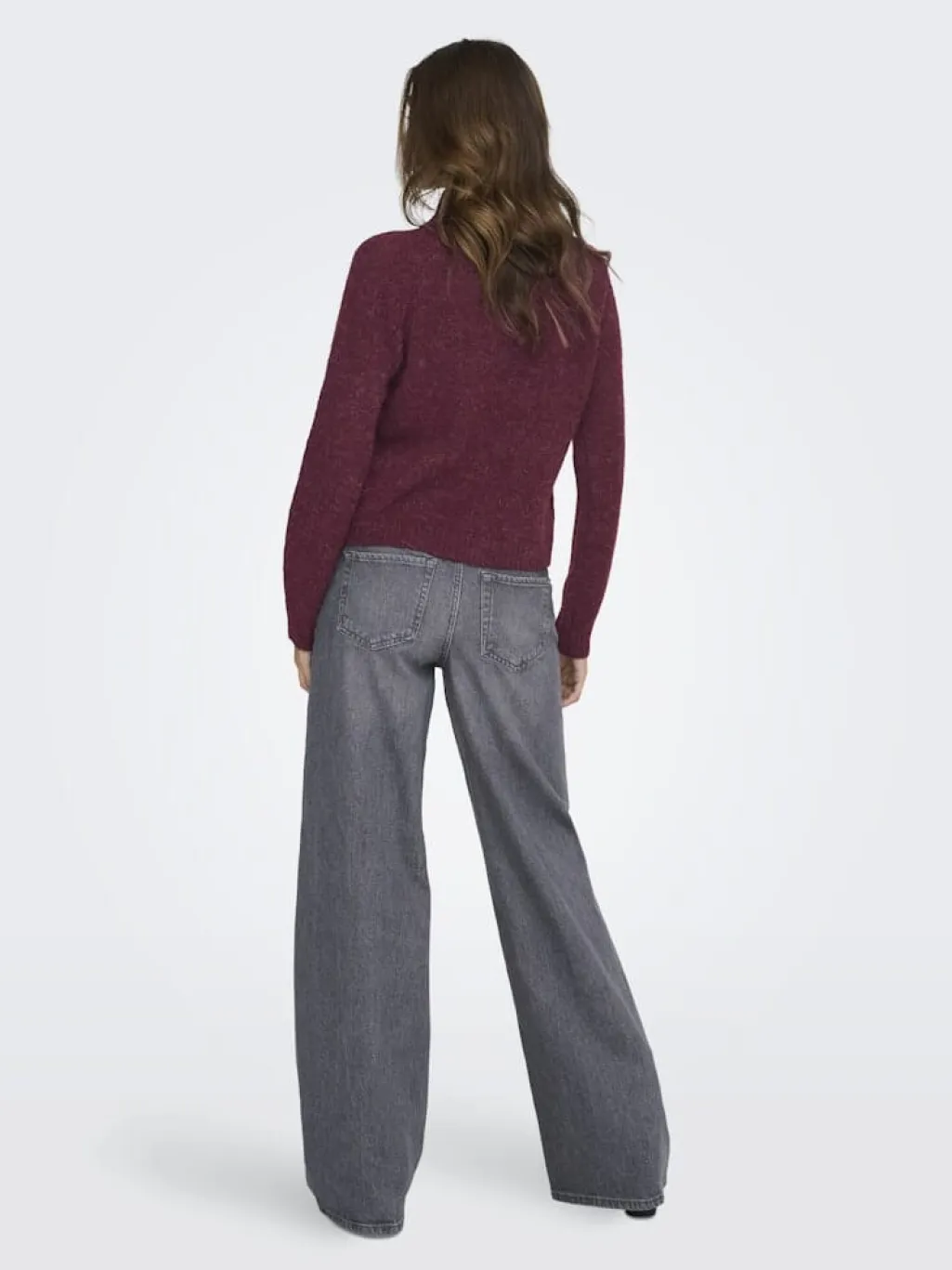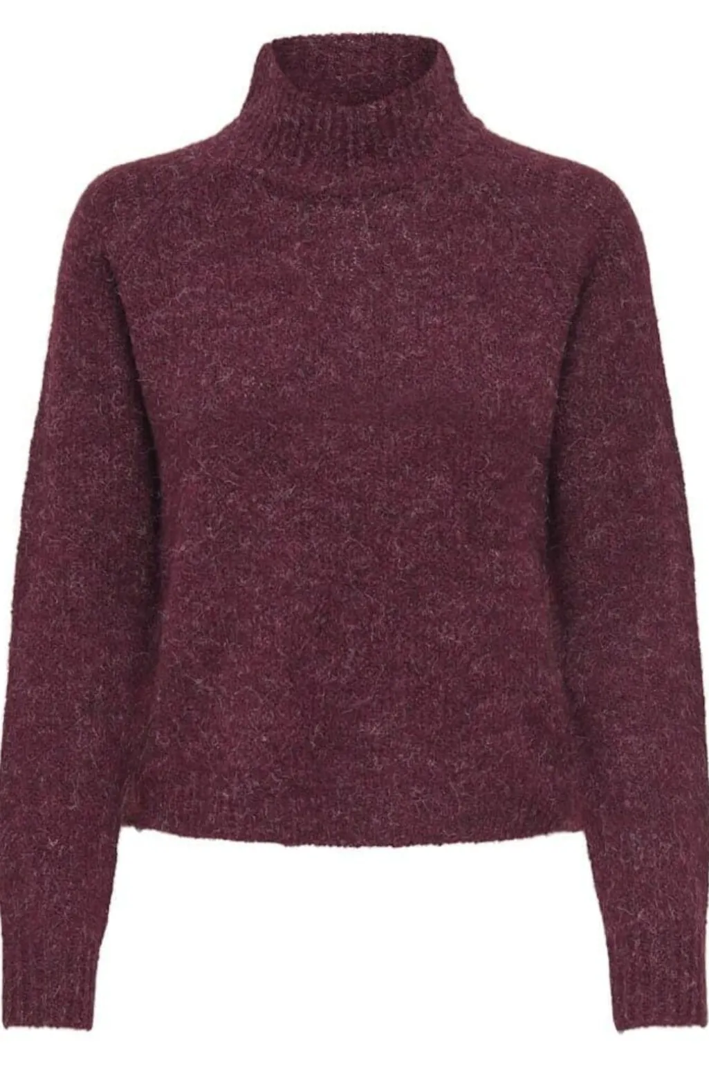 Striktrøje fra JDY i maroonfarvet melange. Den høje hals og raglanærmer giver trøjen en afslappet stil, mens ribkanten ved ærmerne sikrer en god pasform.