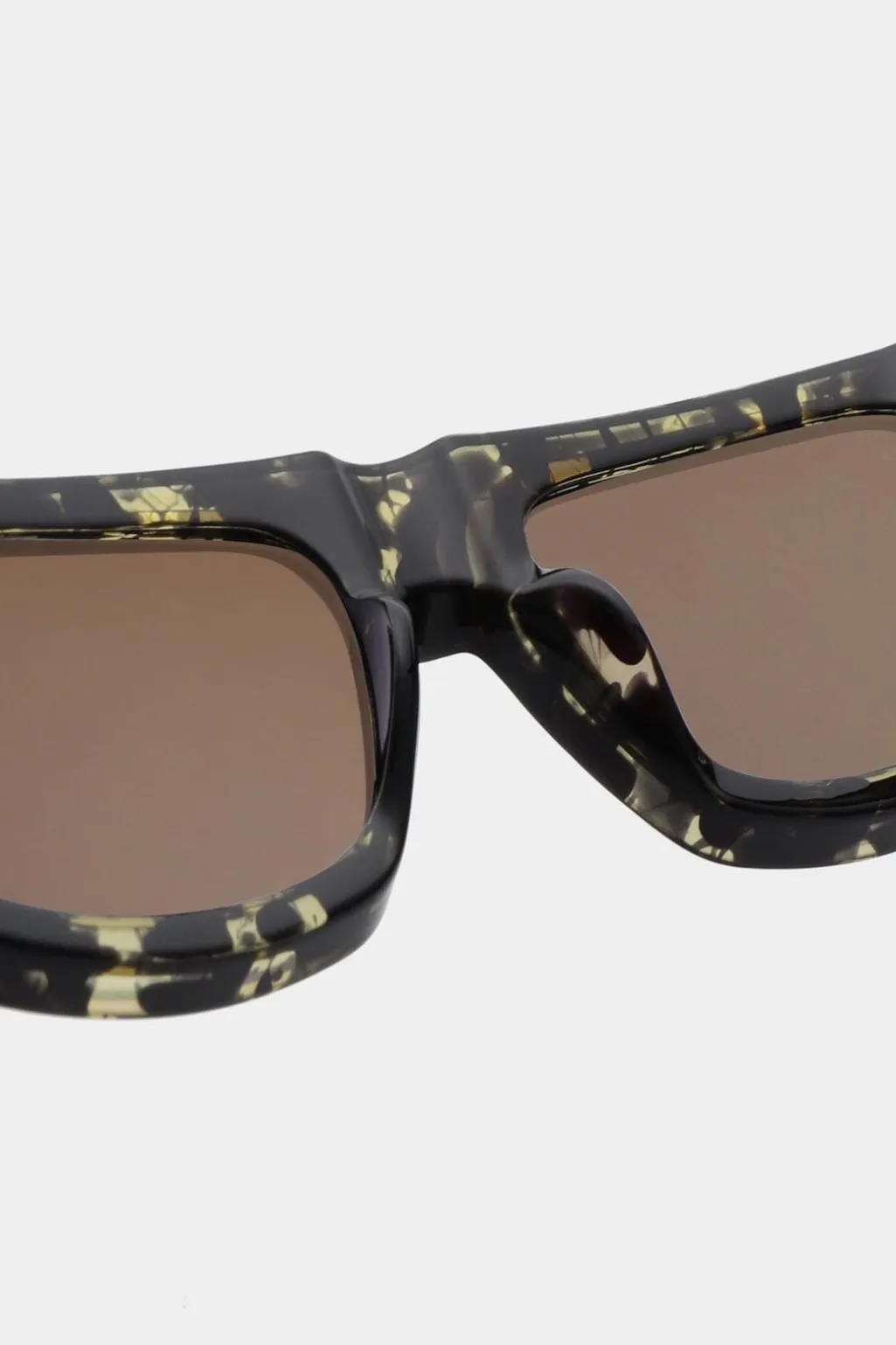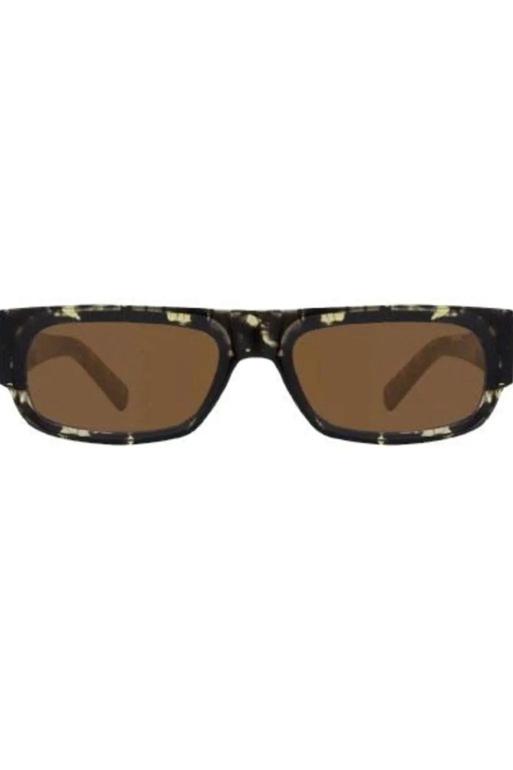 Rektangulære solbriller fra A. Kjærbede med sort og gul tortoise-mønstret stel og brune linser. Stellet har en klassisk form med brune linser og UV 400-beskyttelse.