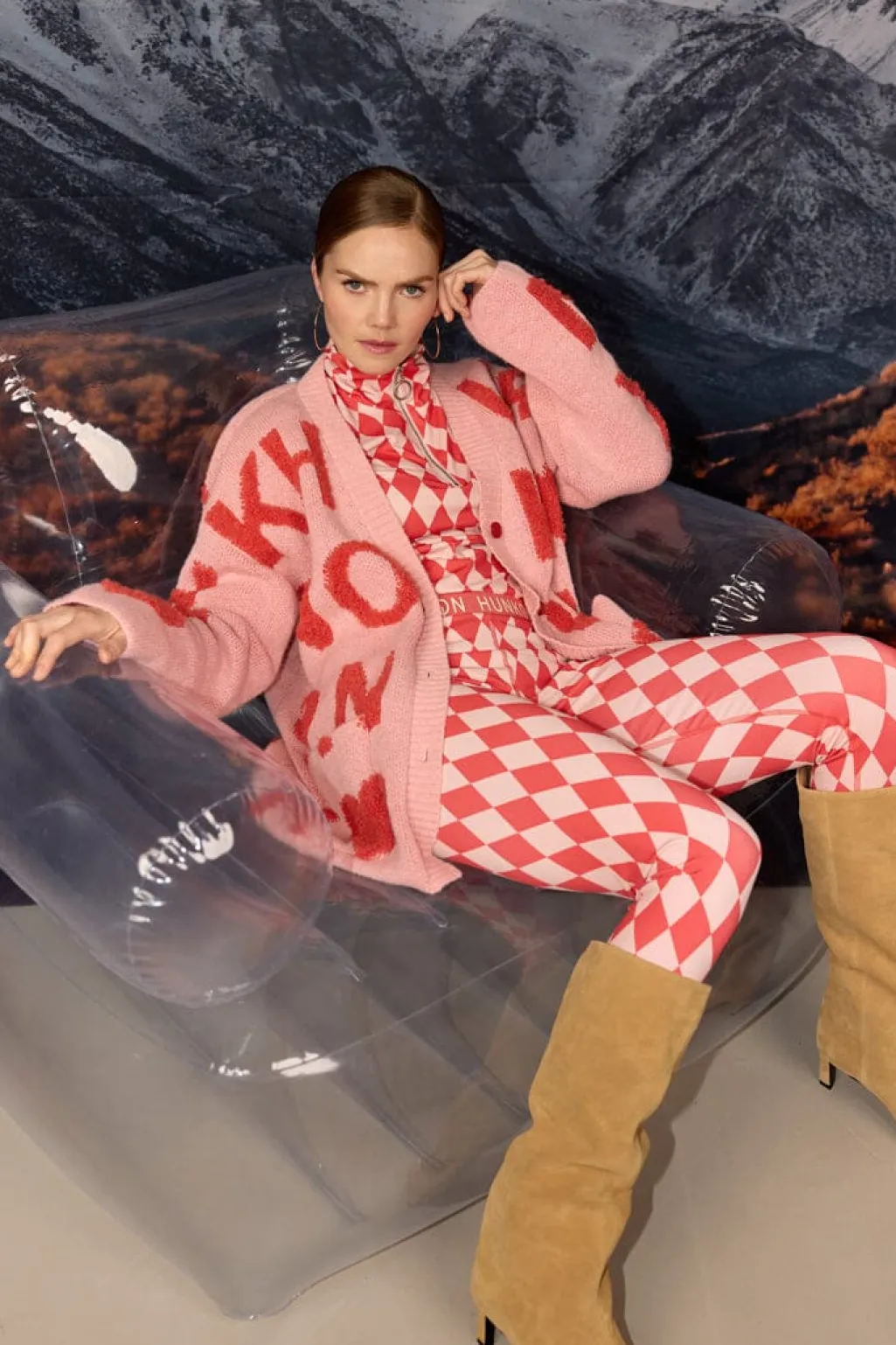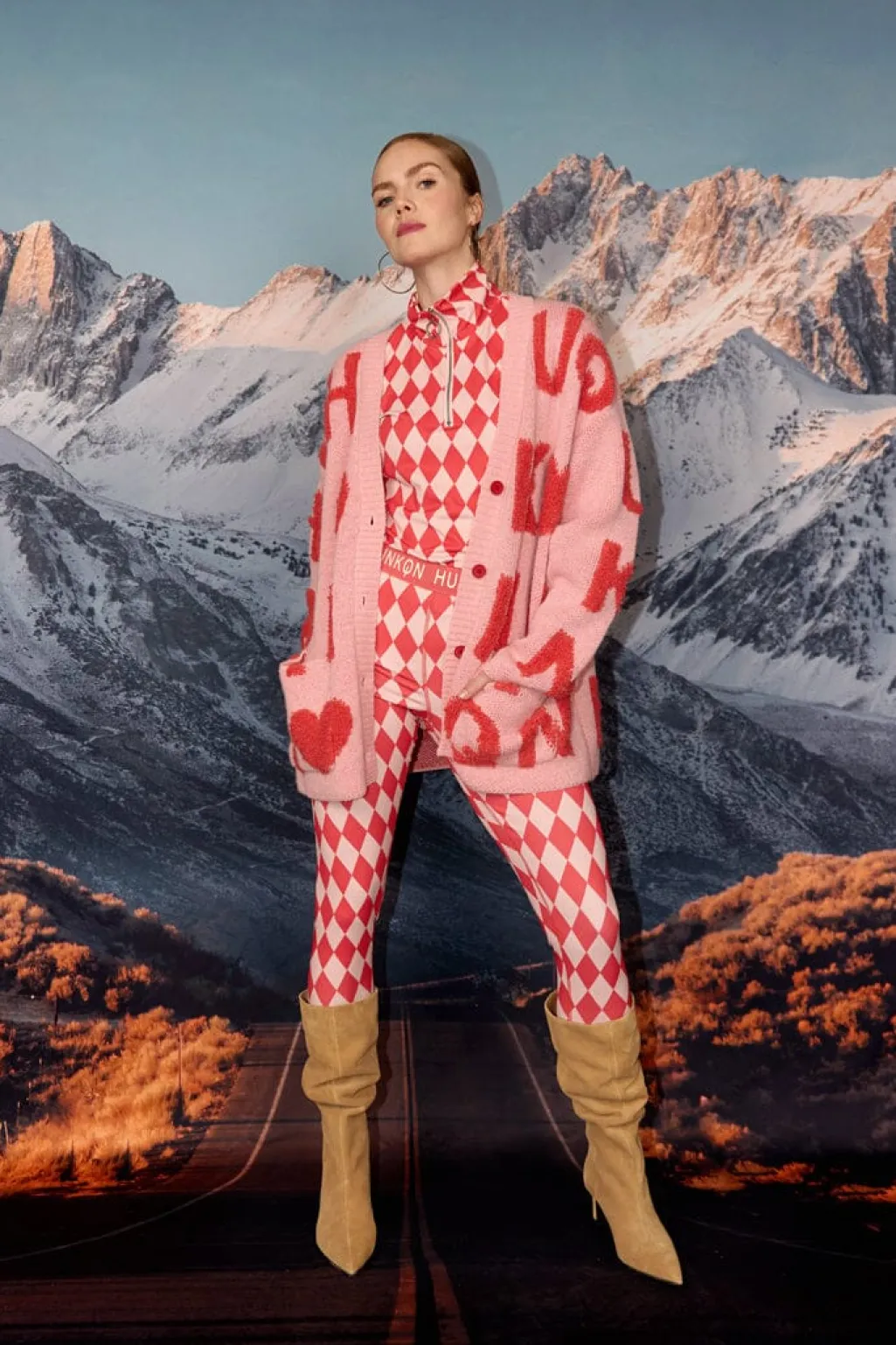Pink cardigan fra Hunkøn med røde bogstaver og symboler. Cardiganen har en V-hals, knaplukning foran og to praktiske lommer. Den oversized pasform giver en afslappet silhuet.