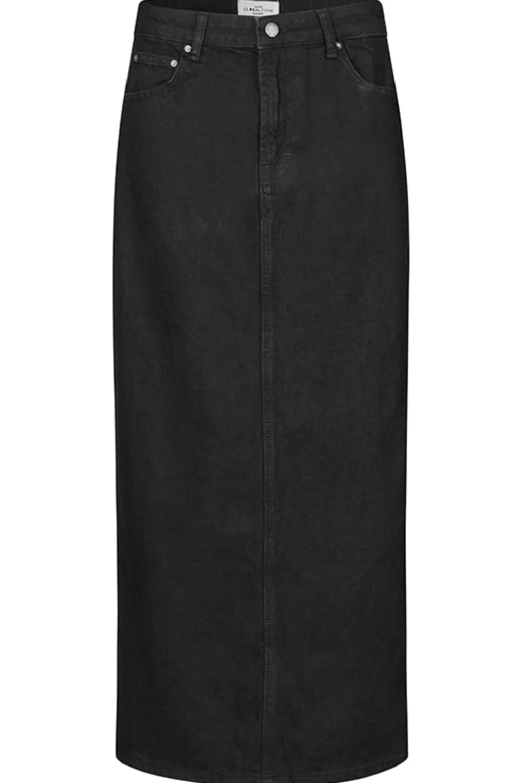 Sort denimnederdel i læglængde fra Global Funk. Nederdelen har en lige silhuet med løs pasform og praktisk lukning med både knapper og lynlås foran.
