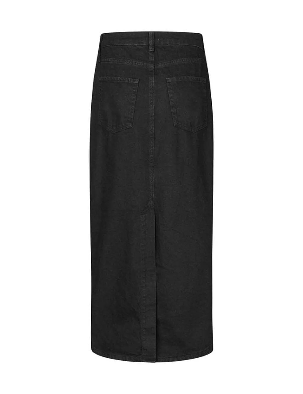 Lang denimnederdel fra Global Funk i farven Black Mix. Nederdelen har en lige pasform med høj talje og knaplukning foran.
