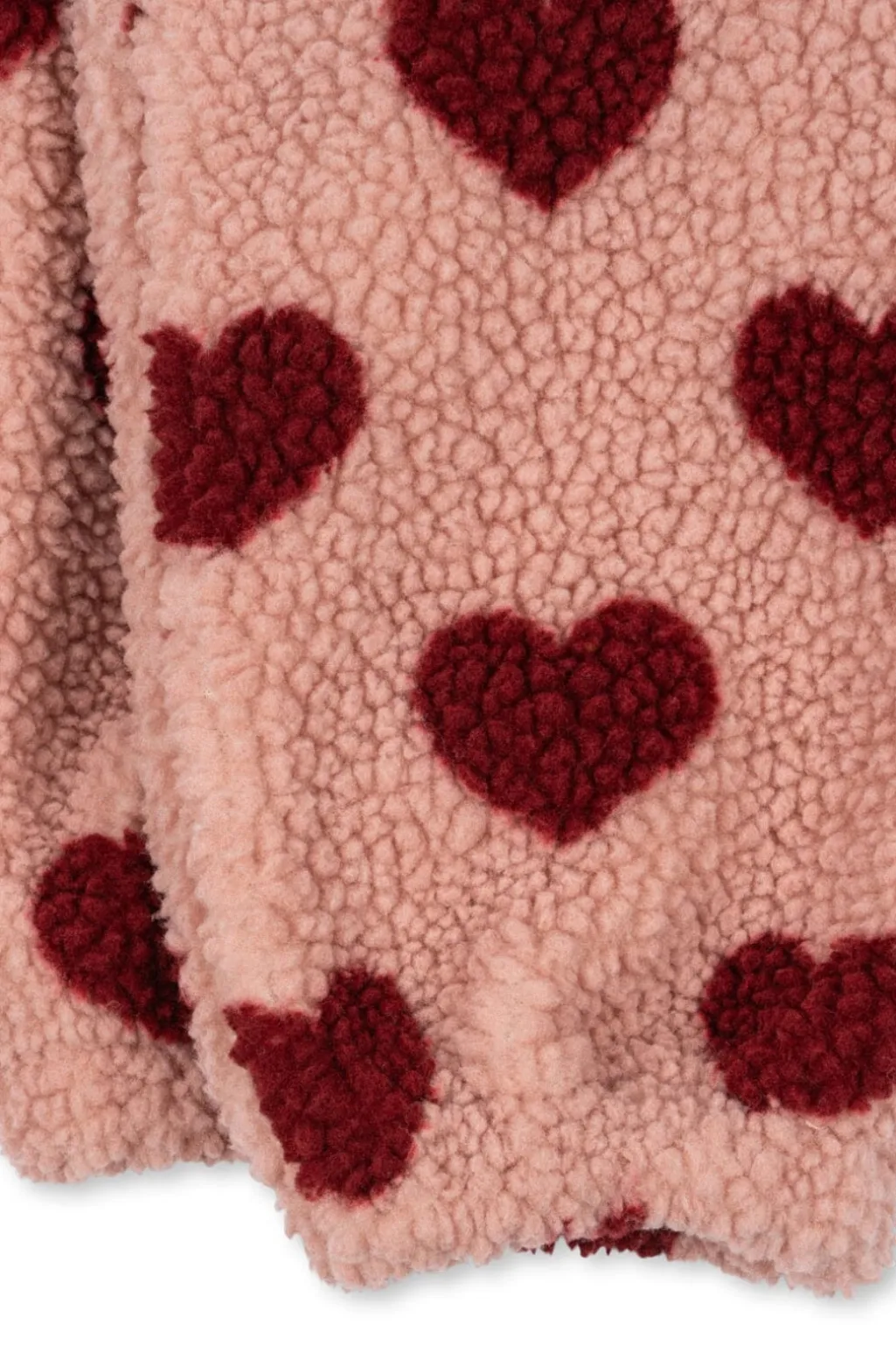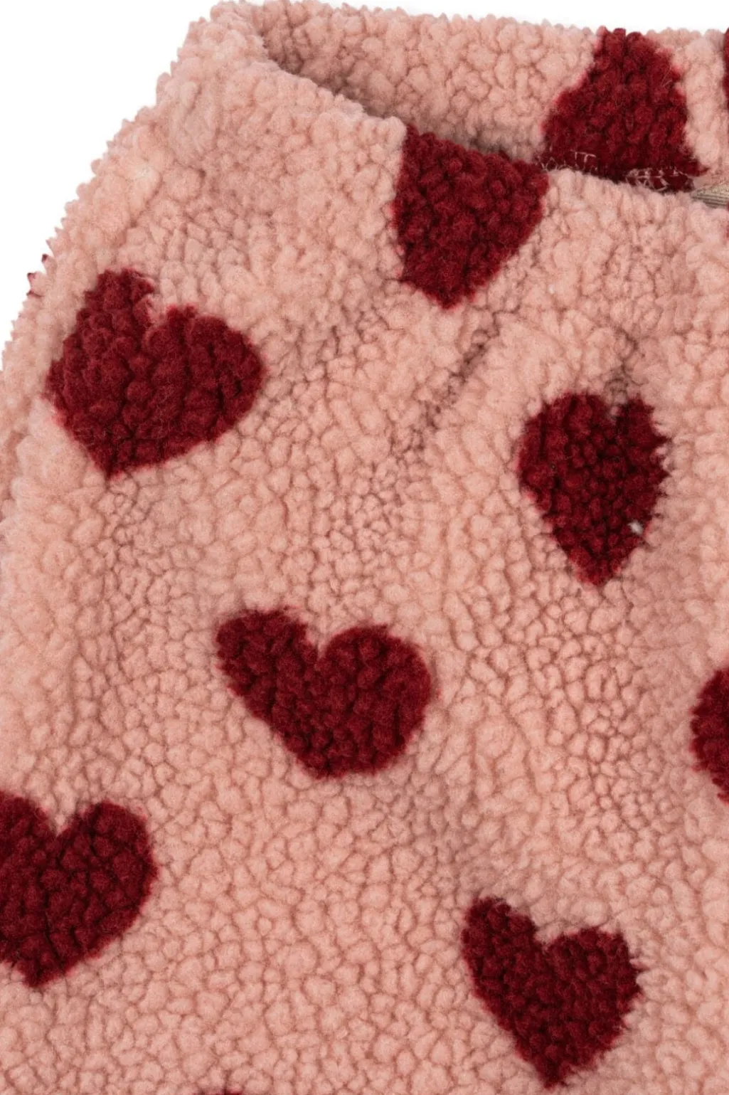 Bukser fra Konges Sløjd i lyserød med røde hjerter. Bukserne er lavet af 100 % genanvendt polyester med en blød tekstur.
