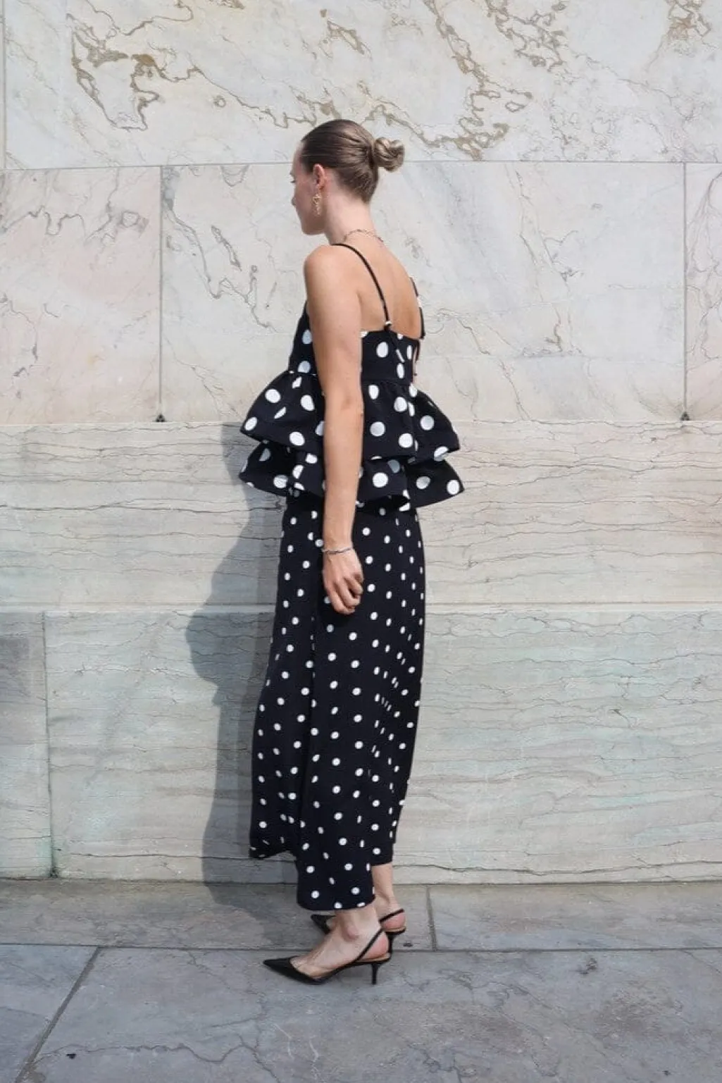 Sort top med store hvide polkaprikker fra Cras. Den firkantede halsudskæring og flæsedetaljerne giver toppen et karakteristisk udtryk. Den sidder løst på kroppen med tynde stropper.