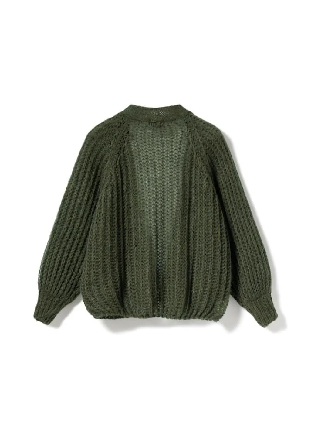 Armygrøn cardigan fra Noella med løs pasform og åben front. Den ribstrikkede tekstur og de let puffede ærmer giver cardiganen et afslappet udtryk.