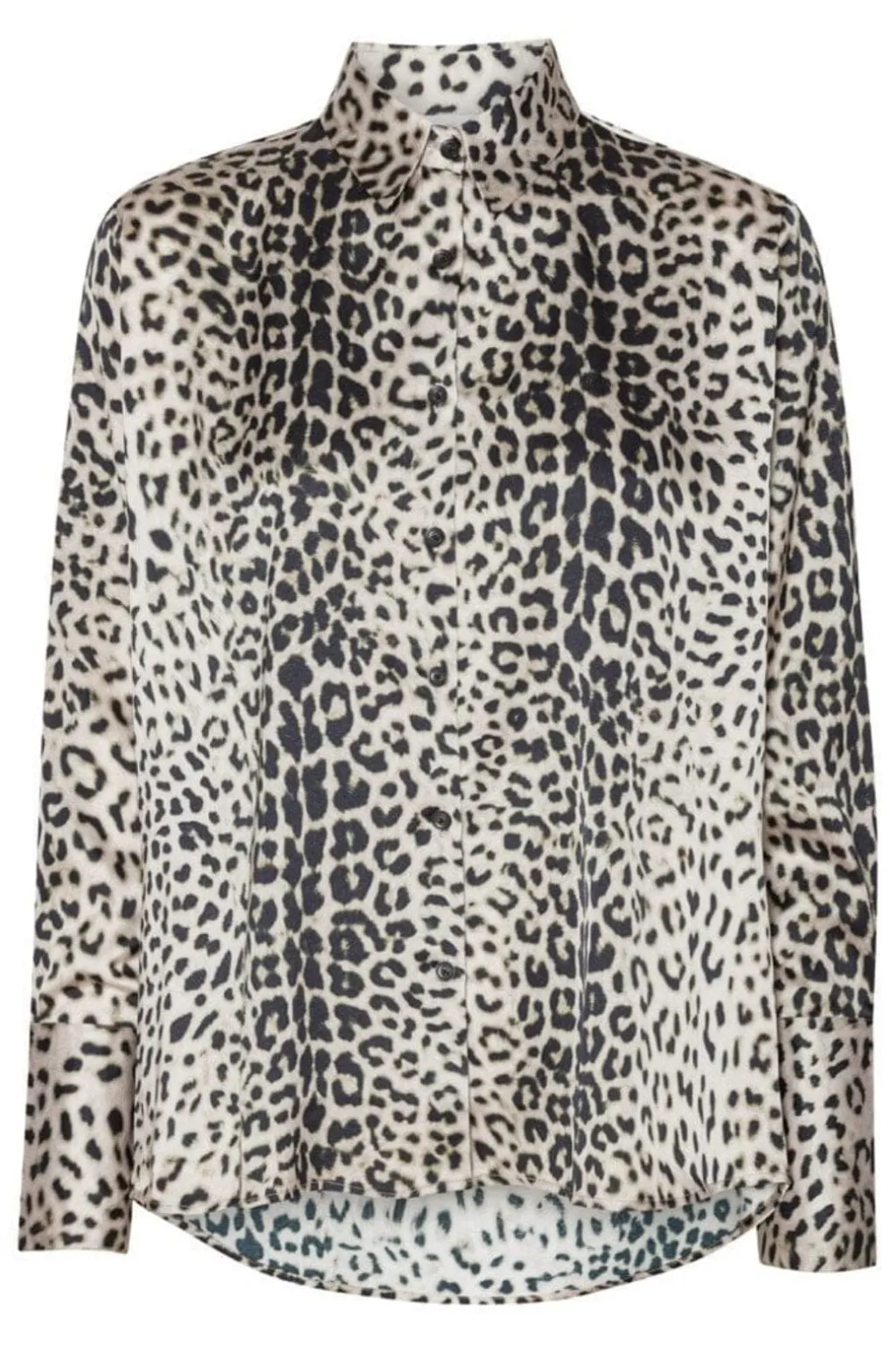 Skjorte i leopardprint med beige og sorte nuancer. Skjorten har skjortekrave, knapper og lange ærmer. Stoffet har en glat og skinnende overflade.