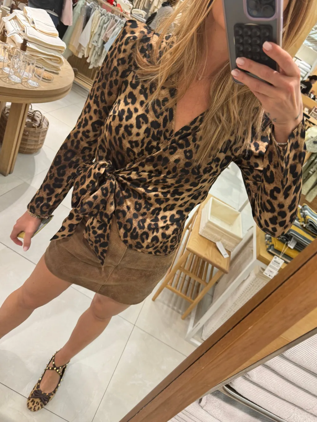 Slå-om-bluse fra Valentin Studio i brune og beige leopardprint. Blusen har V-halsudskæring, lange ærmer og bindebånd i taljen, der skaber en fin silhuet.
