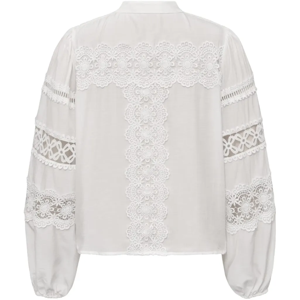 Off-white skjorte fra Gossia med symmetrisk blondedesign. Skjorten har lange pufærmer og en klassisk skjortekrave, der gør den velegnet til både formelle og festlige anledninger.