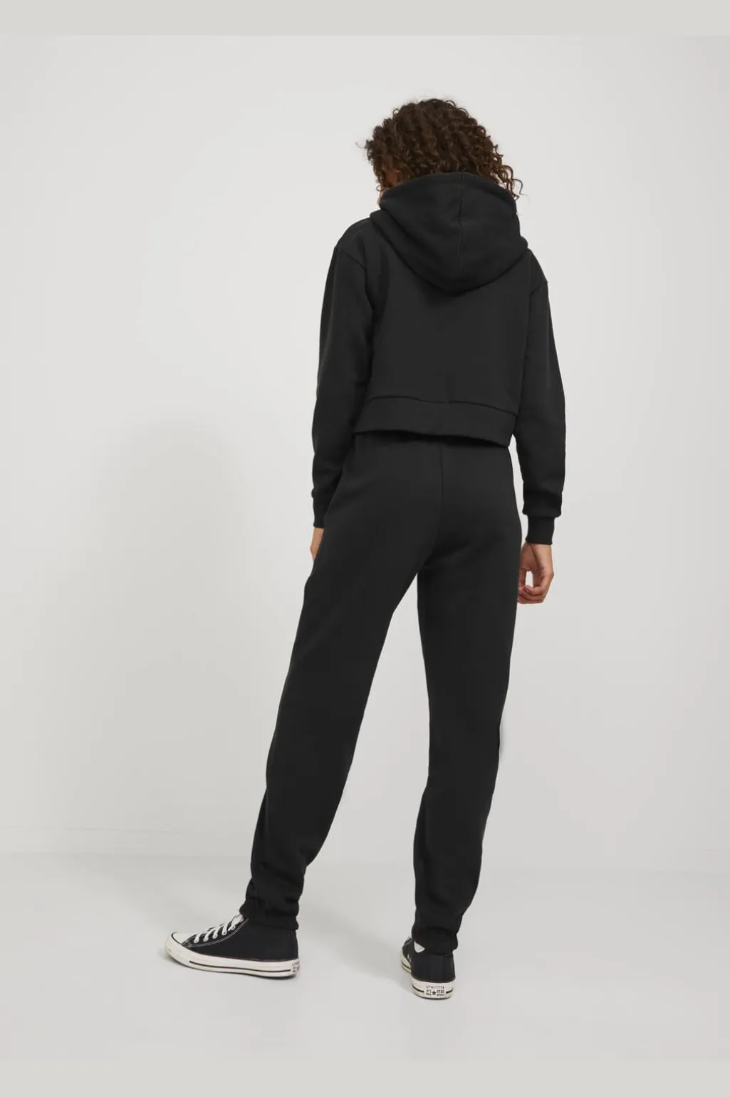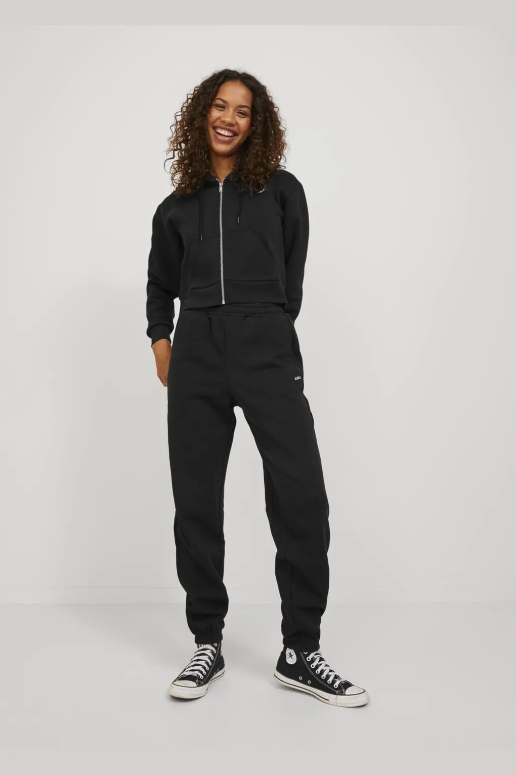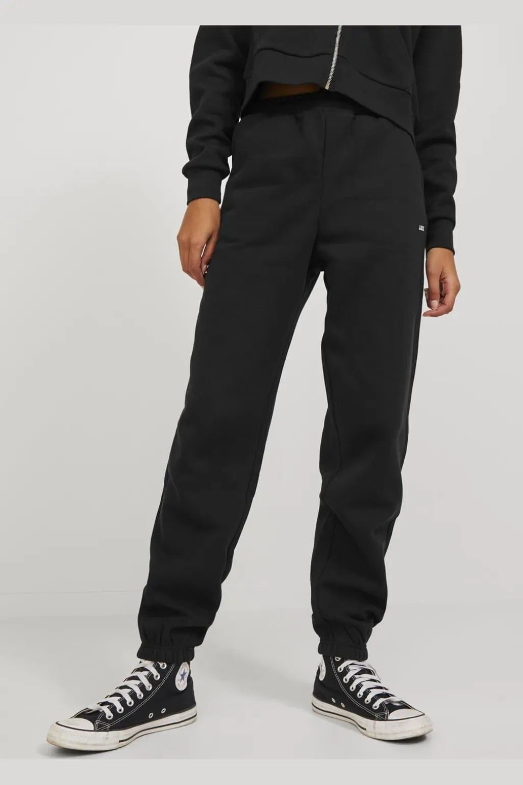 Sorte sweatpants fra Jjxx med høj talje og loose fit. Bukserne har både snøre og elastik i taljen samt elastiske benåbninger. Det strikkede jersey-sweatshirtstof giver god bevægelsesfrihed.