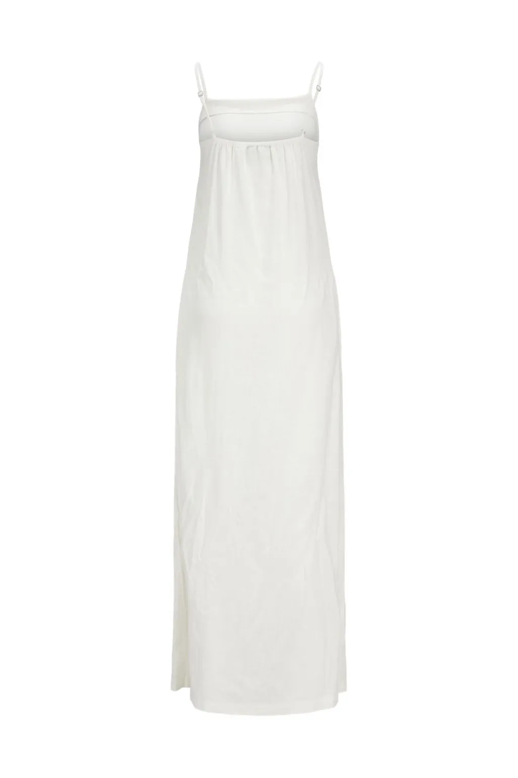 Lang hvid sommerkjole fra Jjxx med tynde spaghettistropper og firkantet halsudskæring. Den løse pasform og det lette materiale gør kjolen behagelig at have på.