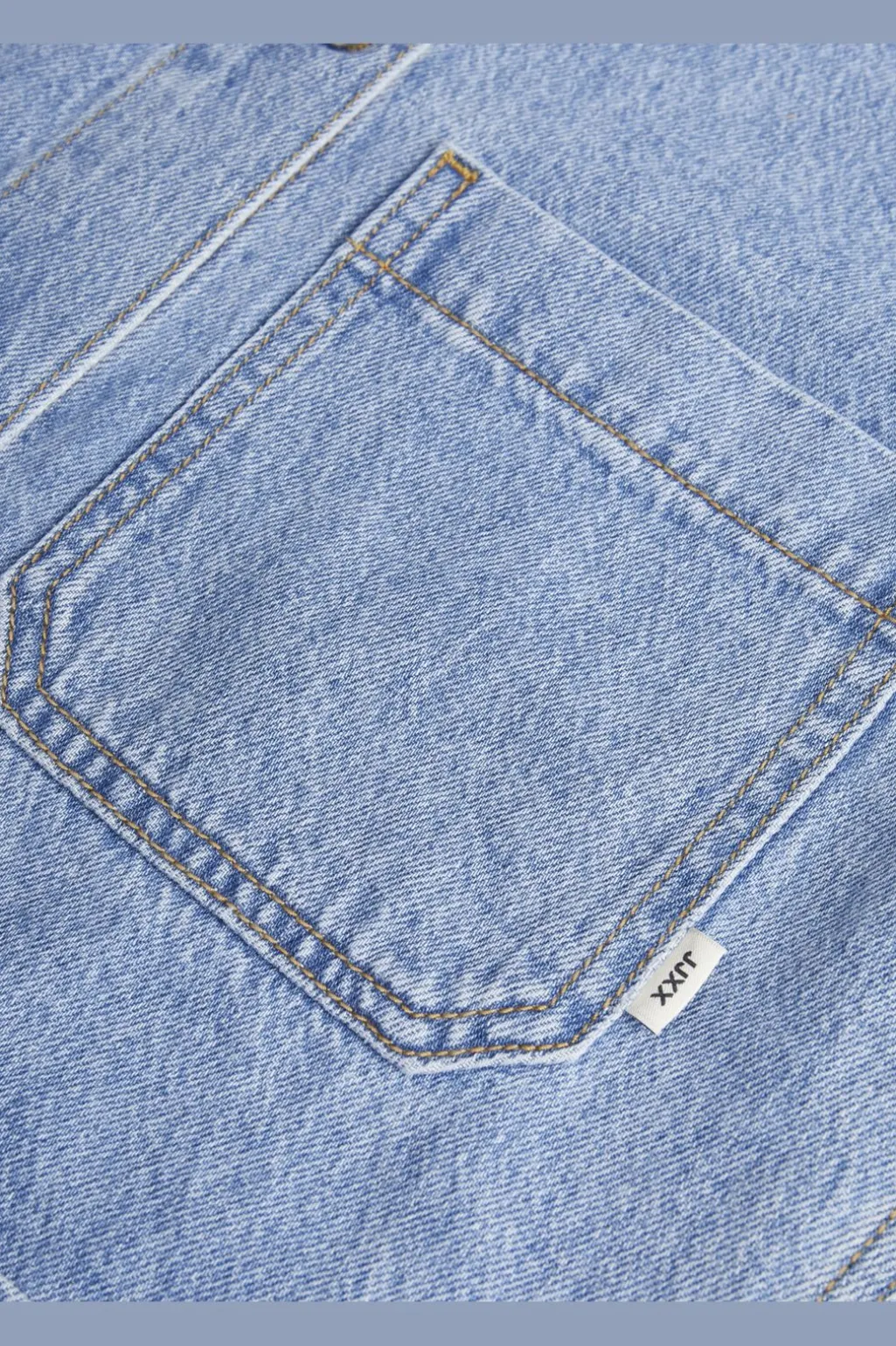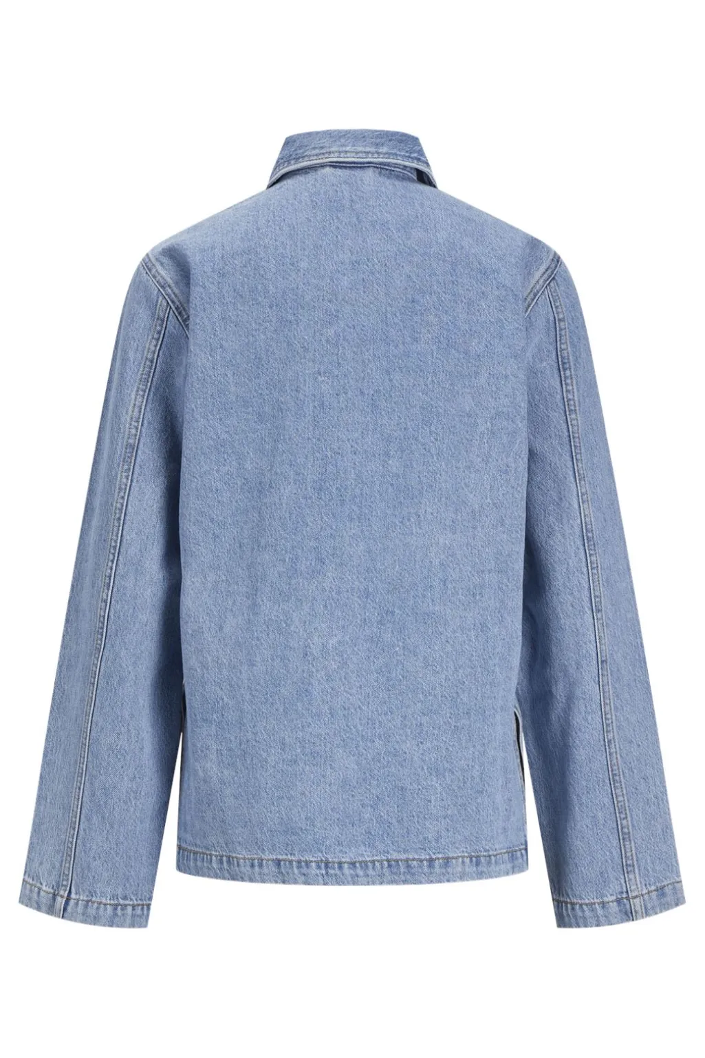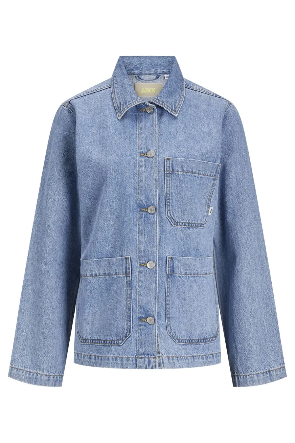 Lyseblå denimjakke fra Jjxx med skjortekrave og knapper. Jakken har to store lommer foran og dekorative syninger, der giver et klassisk worker jacket-look.