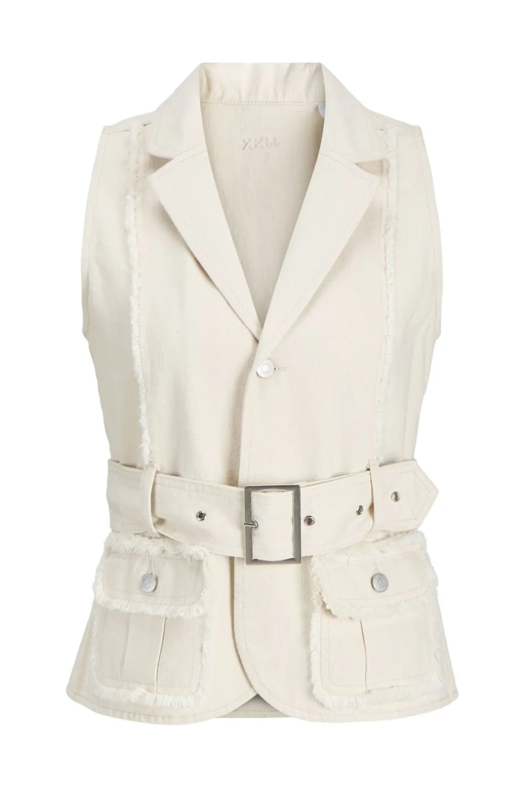 Ærmeløs vest fra Jjxx i raw ecru. Den har skjortekrave, knapper foran og frynsedetaljer ved lommerne. Et bælte i taljen giver mulighed for at tilpasse pasformen.