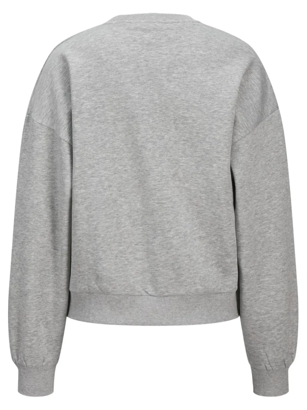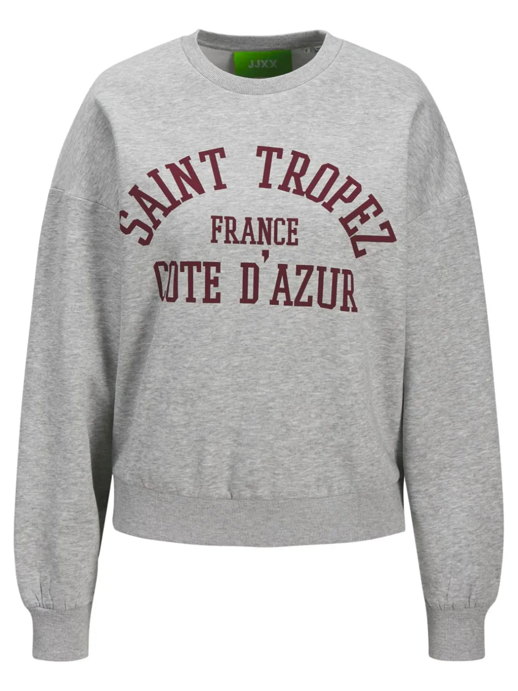 Lys grå sweatshirt fra Jjxx med Saint Tropez-tryk på forsiden. Den har en loose fit-pasform med rund halsudskæring og lange ærmer med elastiske manchetter.