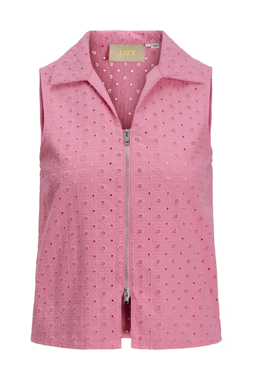 Ærmeløs top fra Jjxx i pink Morning Glory-farve. Toppen har broderie anglaise-mønster med blomsterdetaljer og skjortekrave. Den lukkes med lynlås foran.