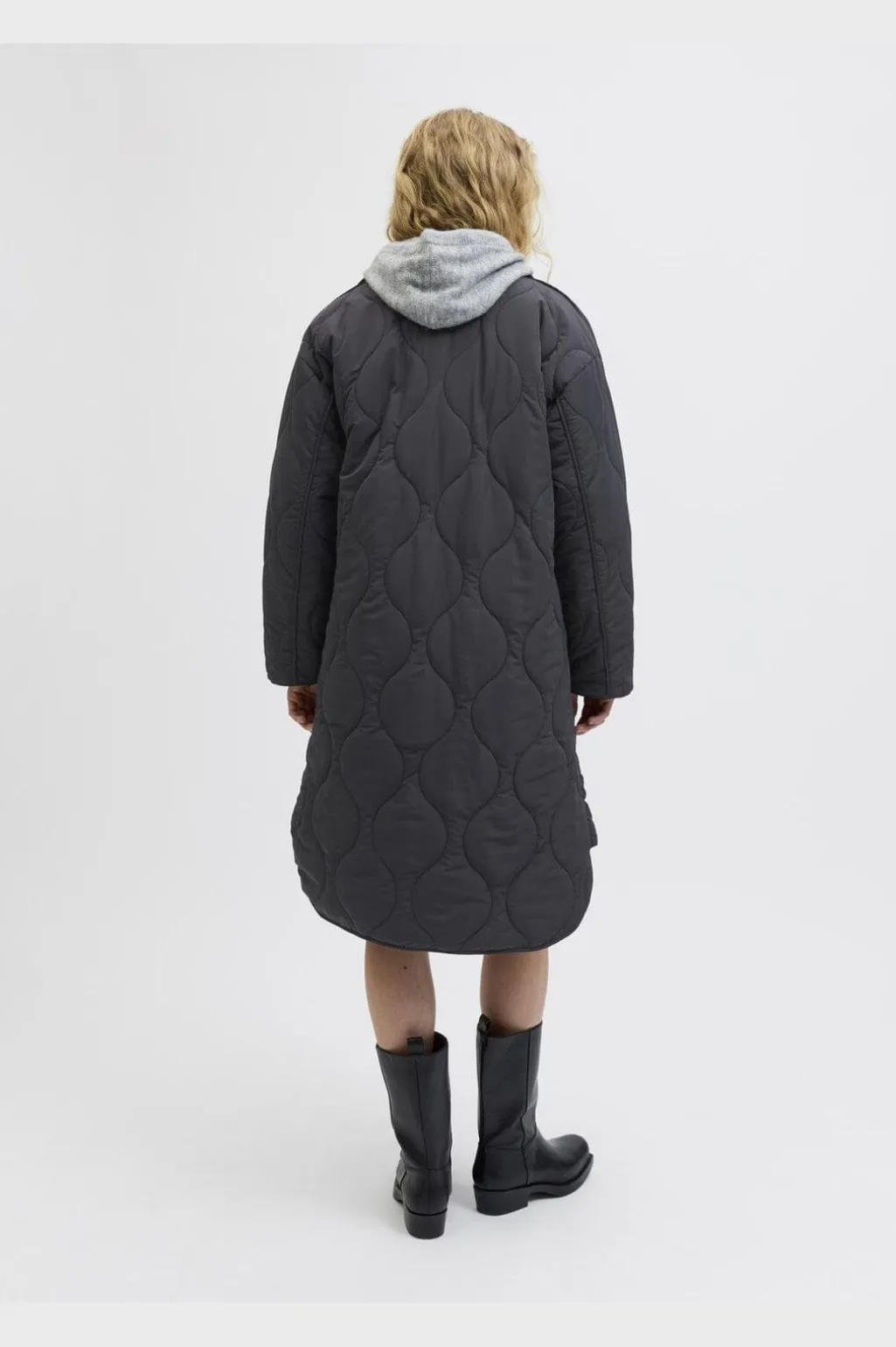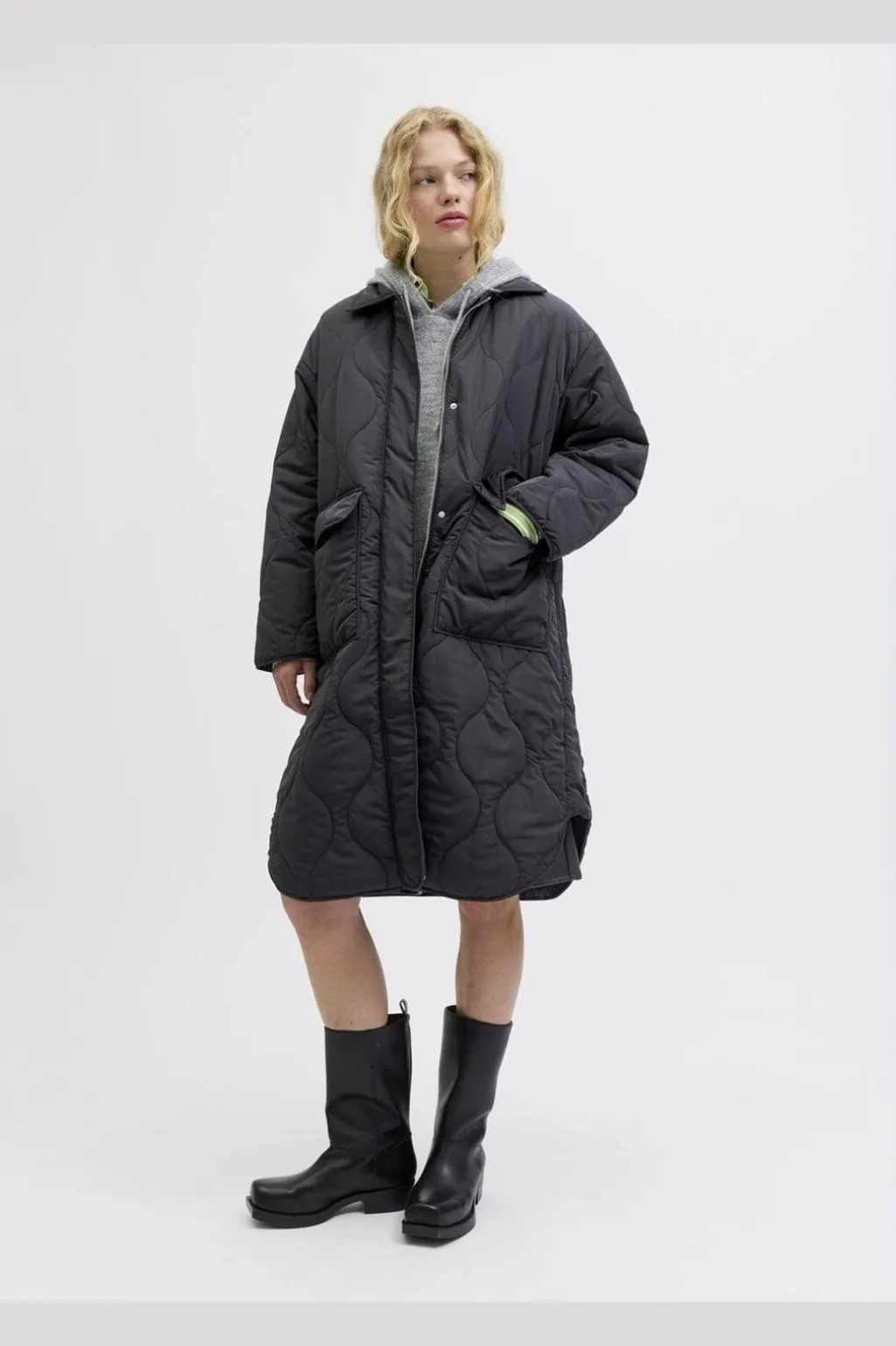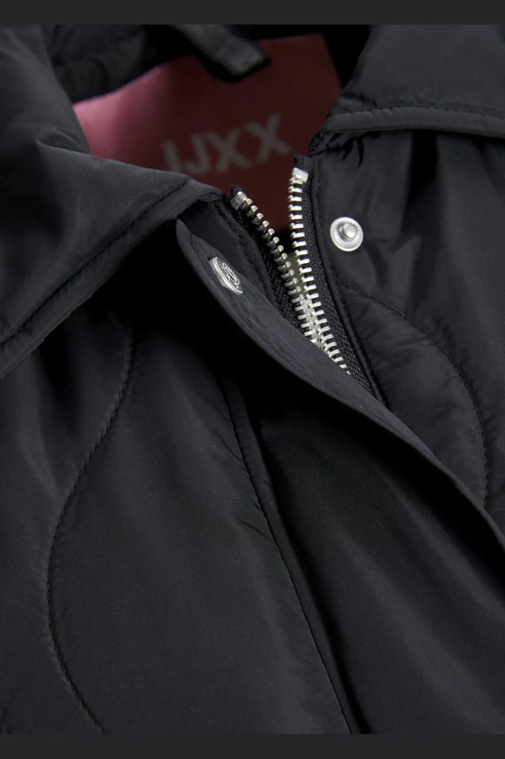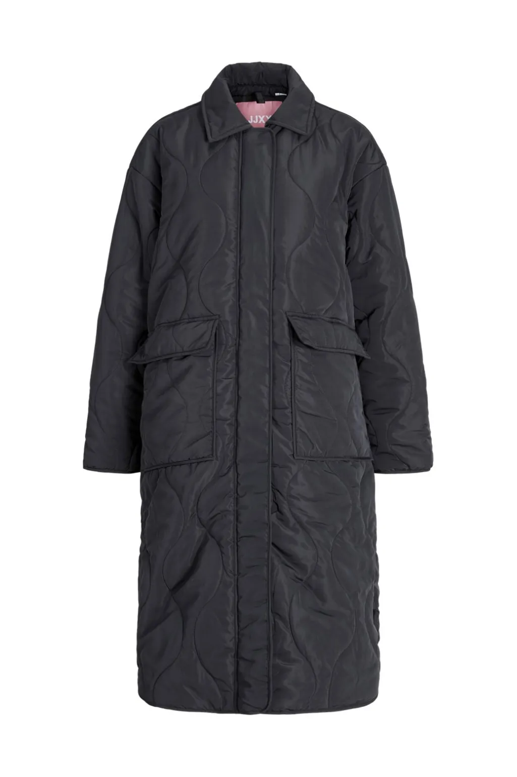 Sort quiltet frakke fra Jjxx med lang pasform og synlige syninger. Frakken har en krave, to forlommer og en skjult lynlås i siden.