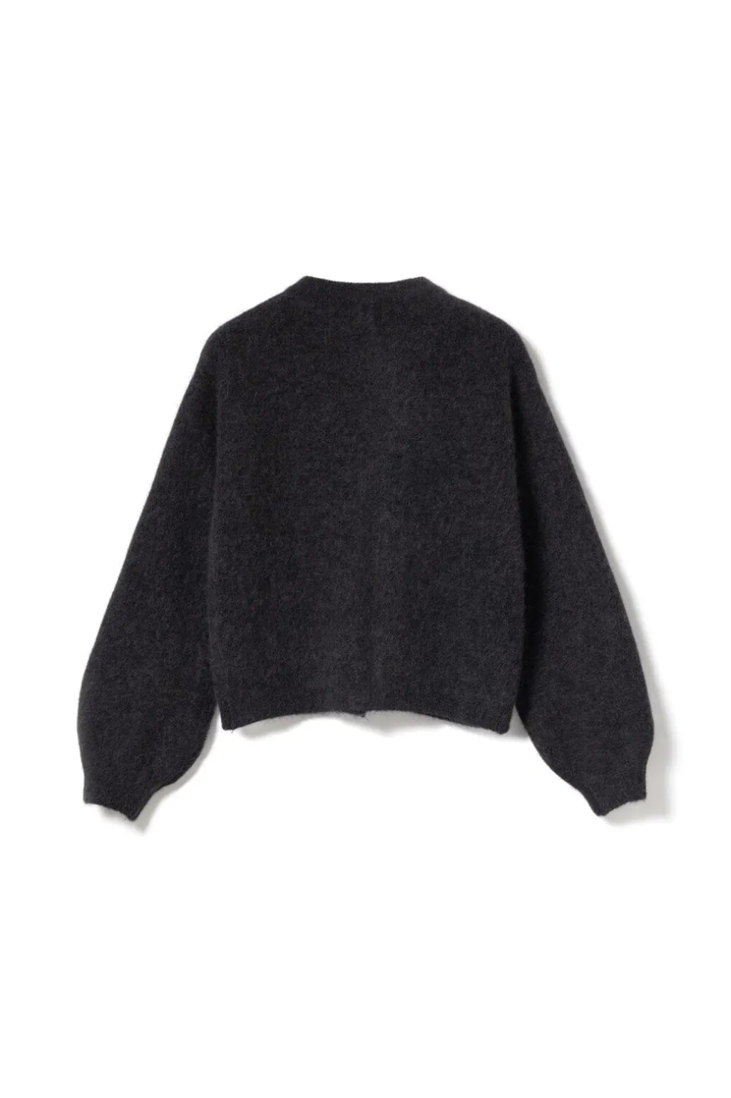 Mørkegrå strikket cardigan fra Noella med puffede ærmer og perleknapper. Den løse pasform og den bløde materialeblanding giver en behagelig cardigan til hverdagen.
