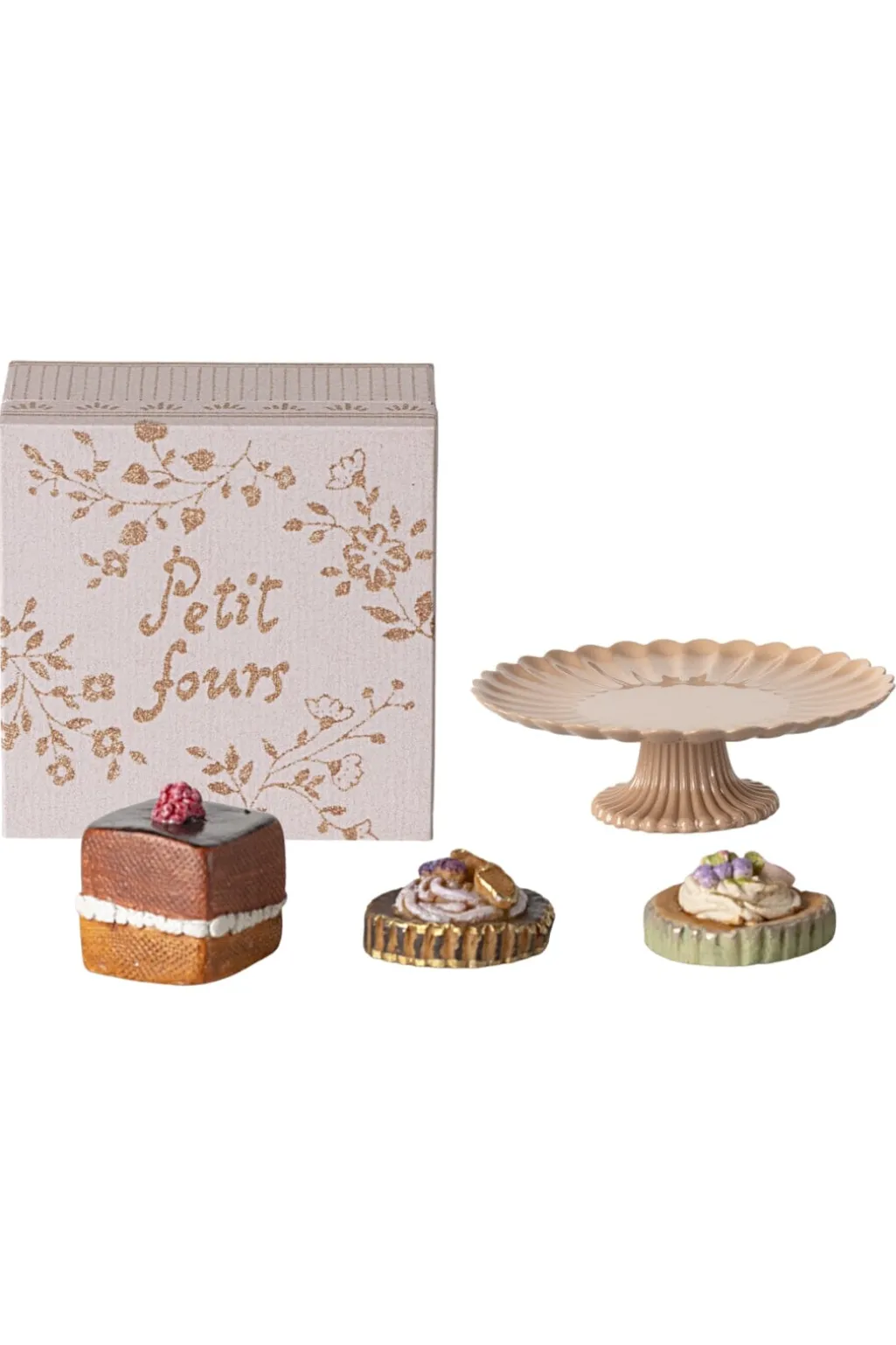 Rosa kagefad i miniature fra Maileg med bølgede kanter og dekorativ fod. Fadet kommer med tre forskellige mini-desserter: en kage med hindbær og to småkager.