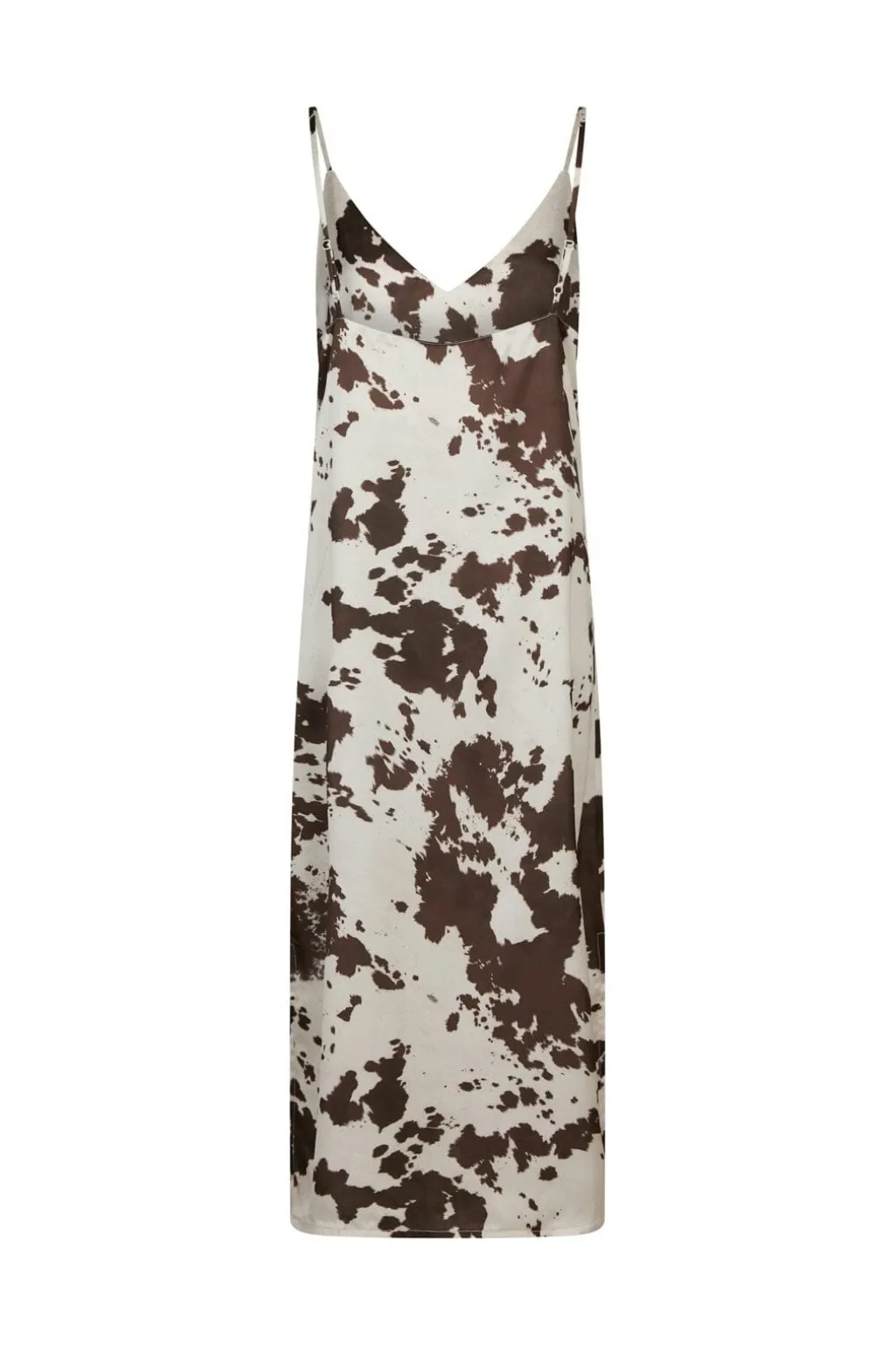 Lang kjole fra Neo Noir med brun-hvidt ko-print. Kjolen har tynde stropper og en V-halsudskæring. Den løse pasform og sideslids giver god bevægelsesfrihed.