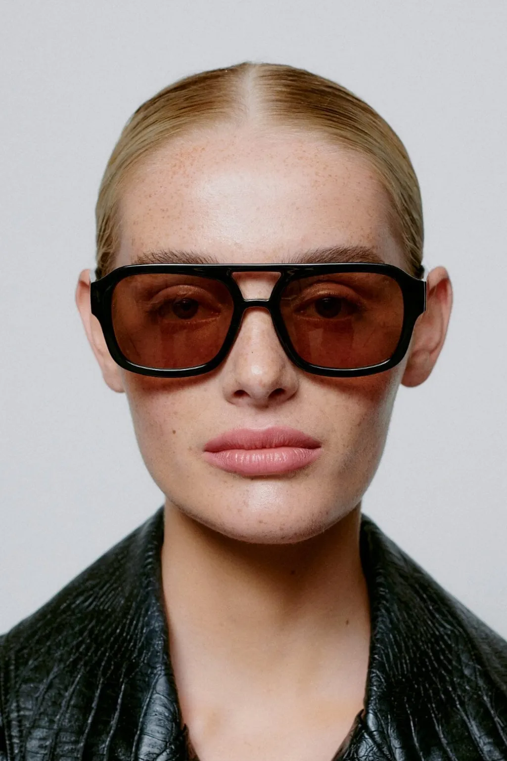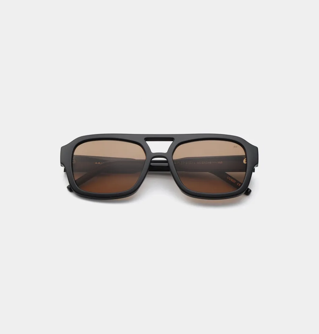 Sorte solbriller fra A. Kjærbede med tyk sort ramme og brune linser. Brillerne har en rektangulær form og er lavet af holdbart polycarbonat.