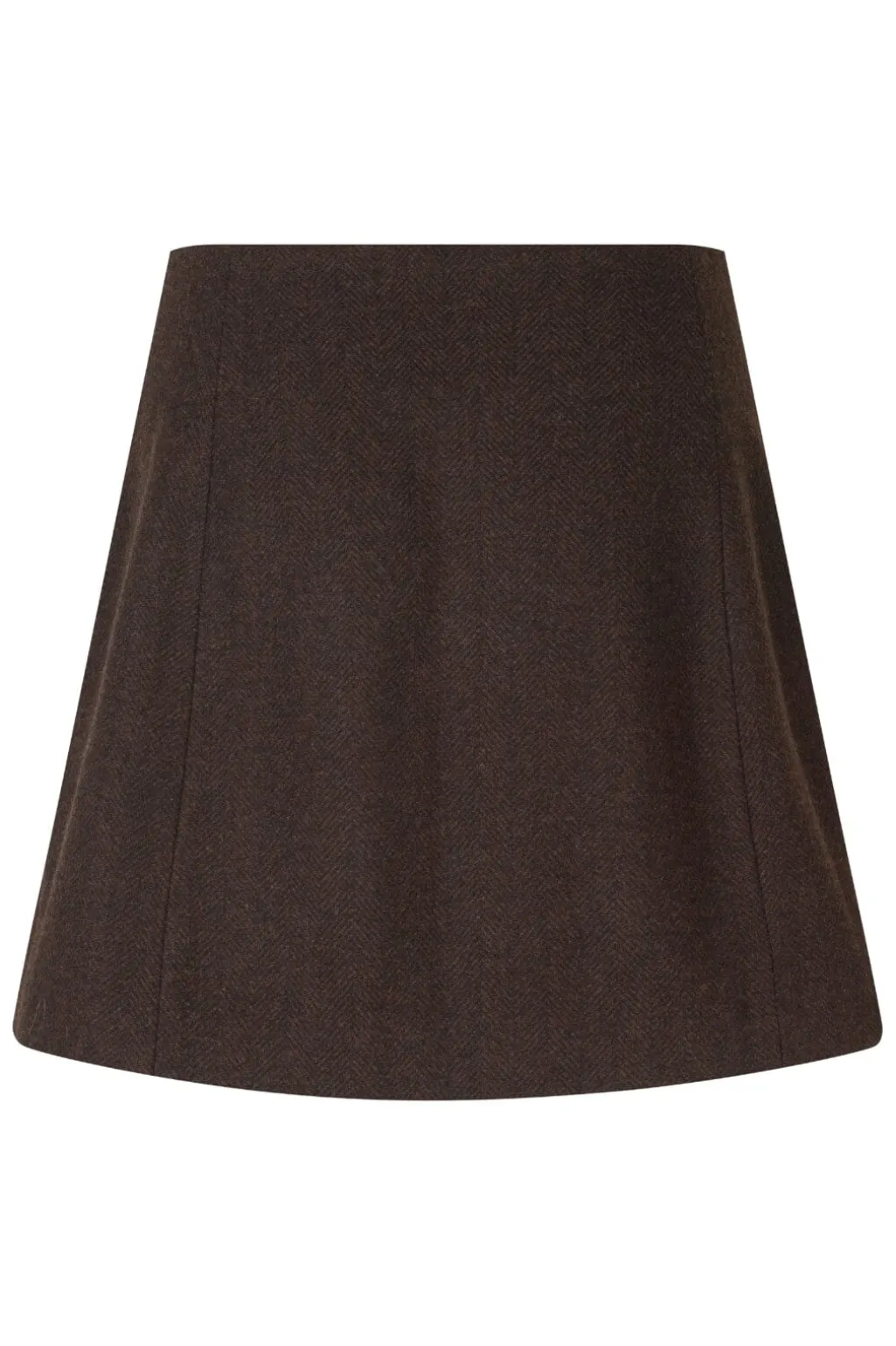 Nederdel fra MbyM i brun-sort twill med fiskebenmønster. Passer til både casual og formelle lejligheder med en alsidig stil.