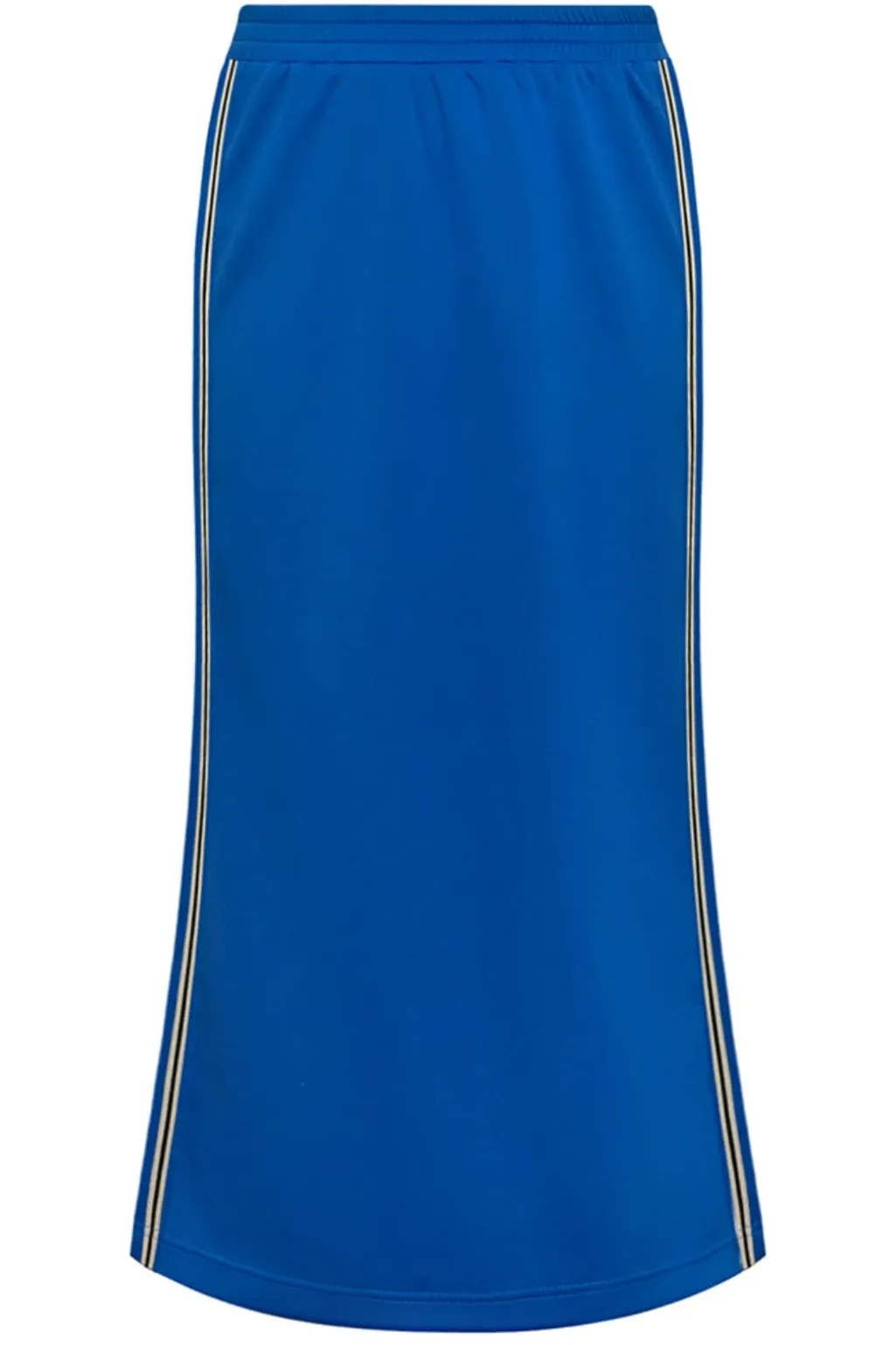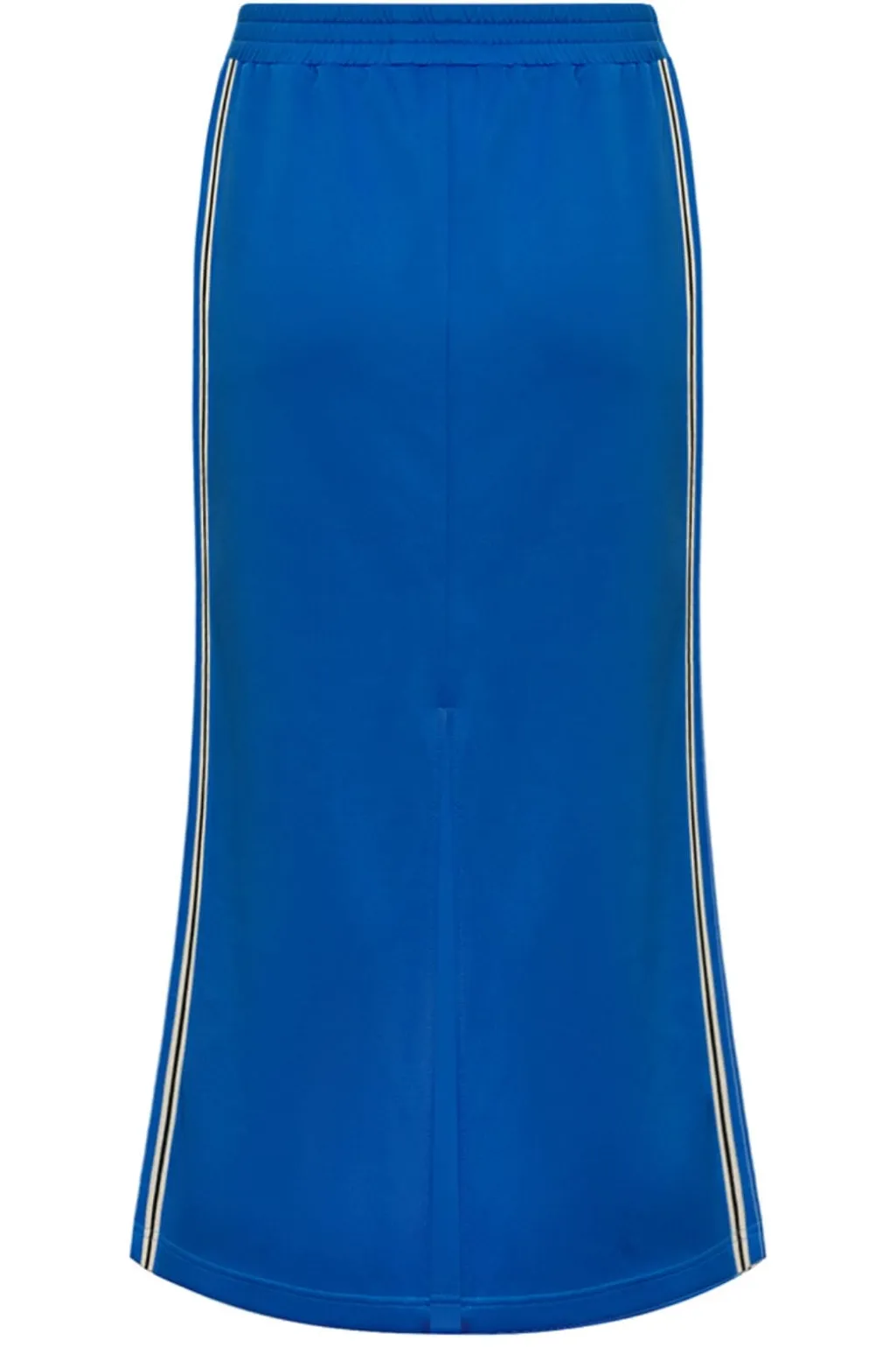 Blå tracknederdel fra Gossia med ankellængde. Den har lige snit med let flare mod bunden og hvide striber på siderne. Designet kombinerer sporty detaljer med en enkel stil.