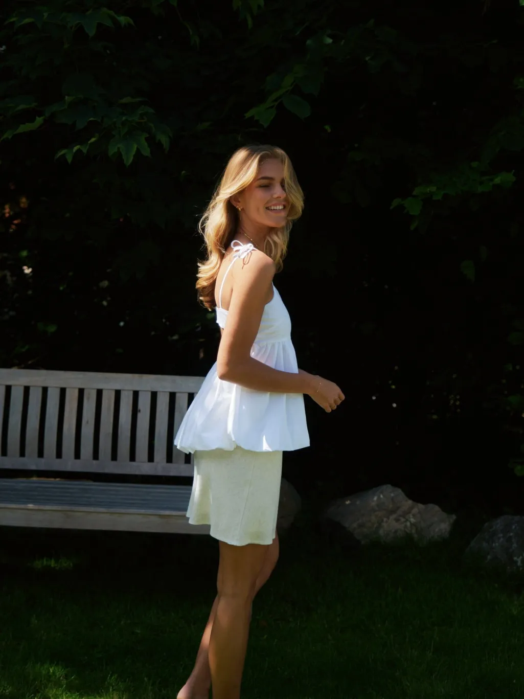 Hvid poplin-top fra Neo Noir med tynde stropper og ballon-effekt. Toppen har bindebånd og flæser, der giver et feminint udtryk. Den tætsiddende pasform ved brystet skaber en flot silhuet.