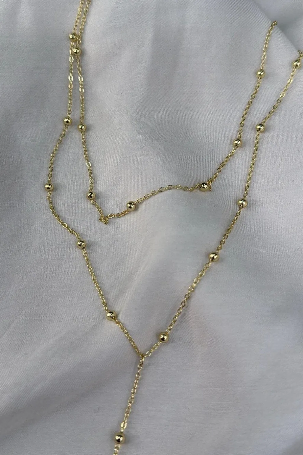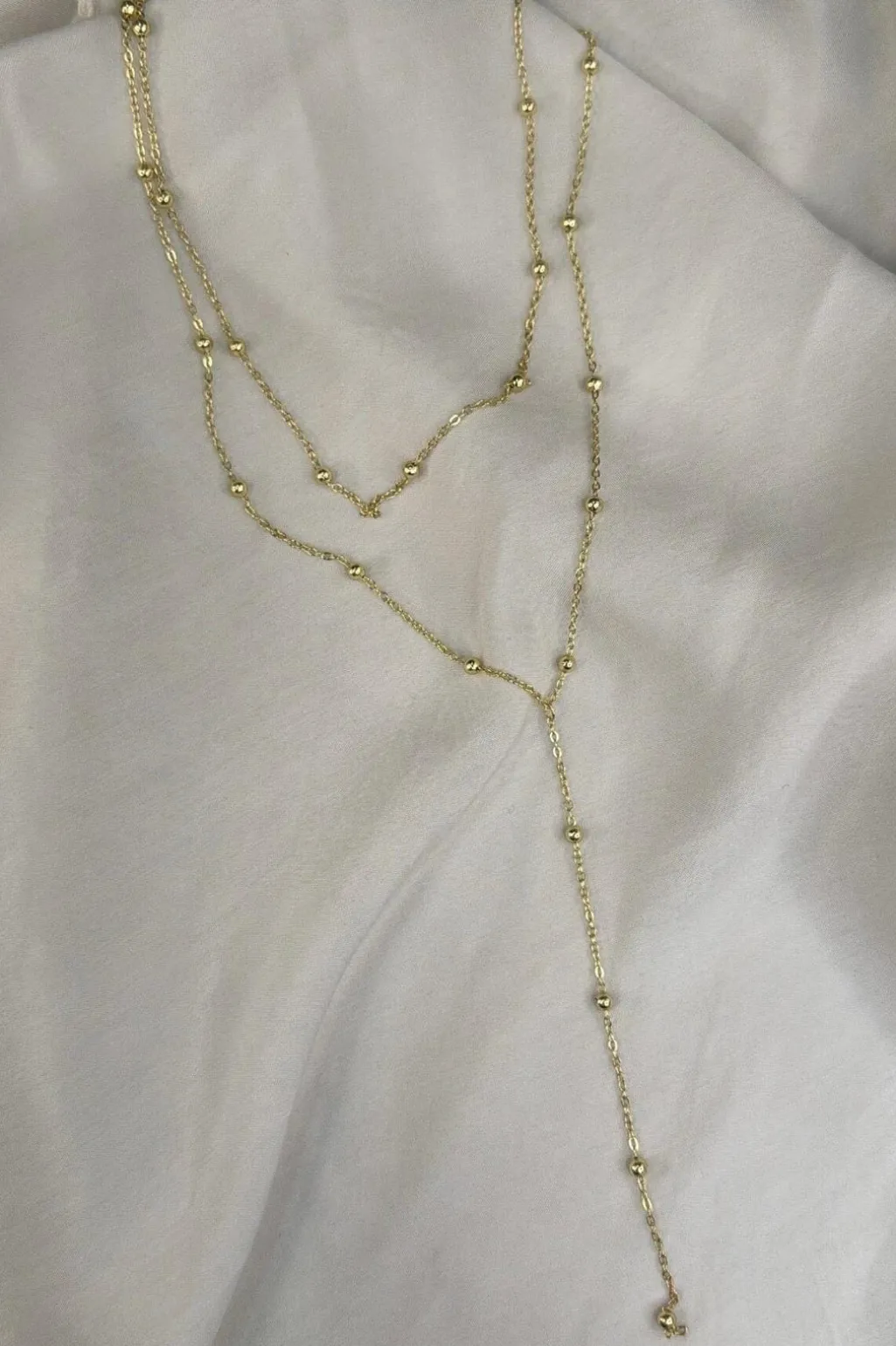 Forgyldt halskæde fra Molly&My Jewellery med små kugler fordelt langs kæden. Designet har flere lag og en Y-formet struktur.