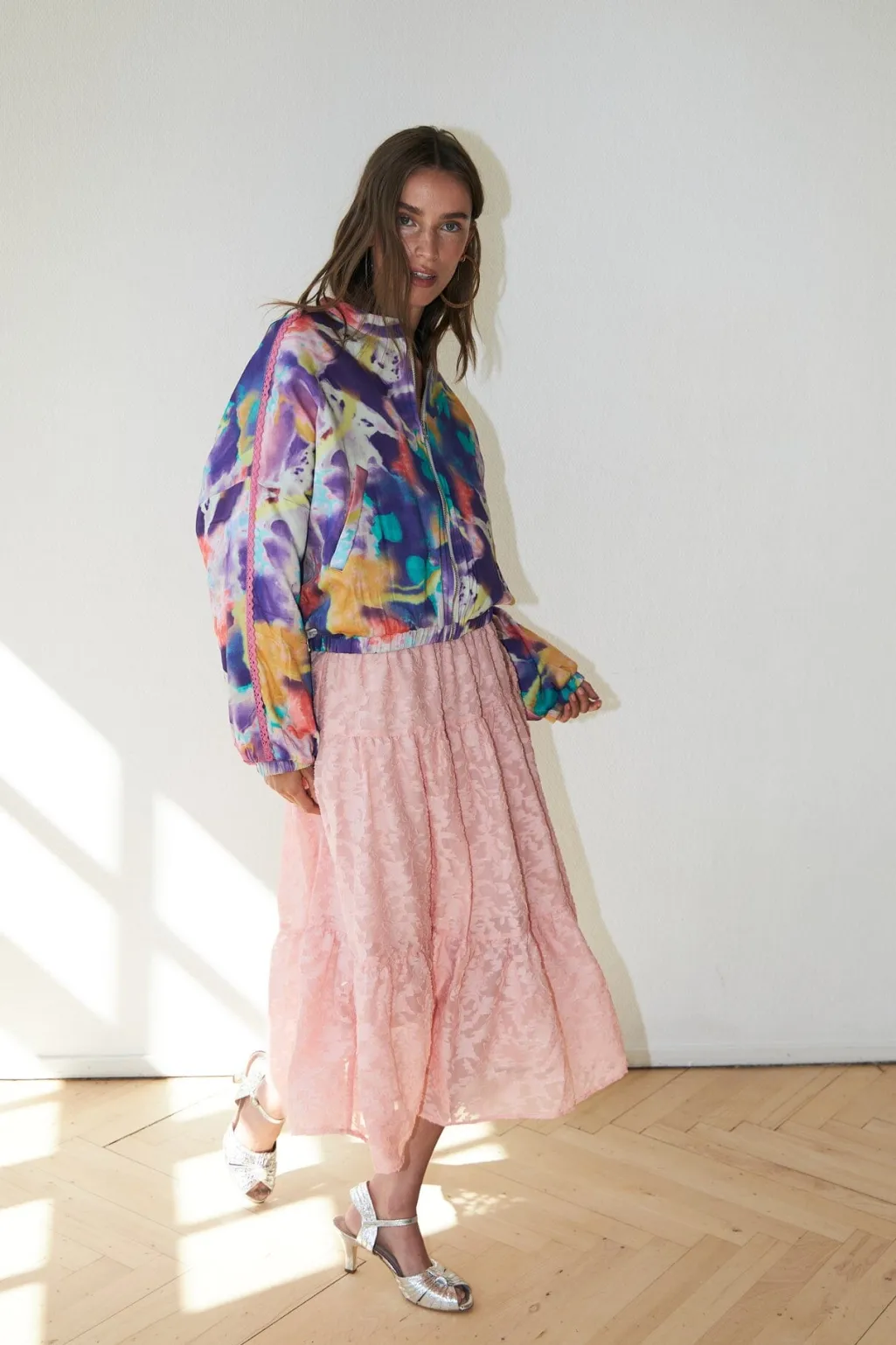 Jakke fra Lollys Laundry med et farverigt mønster i lilla, pink, gul og grønne nuancer. Jakken har en oversized pasform og en høj hals.