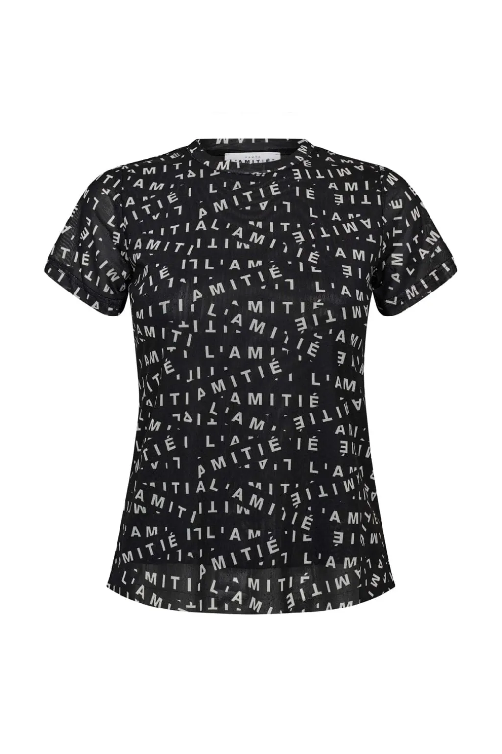 Sort T-shirt fra Haute L’Amitié med ordet L’AMITIÉ trykt som mønster over hele stoffet. T-shirten har korte ærmer og en rund halsudskæring.