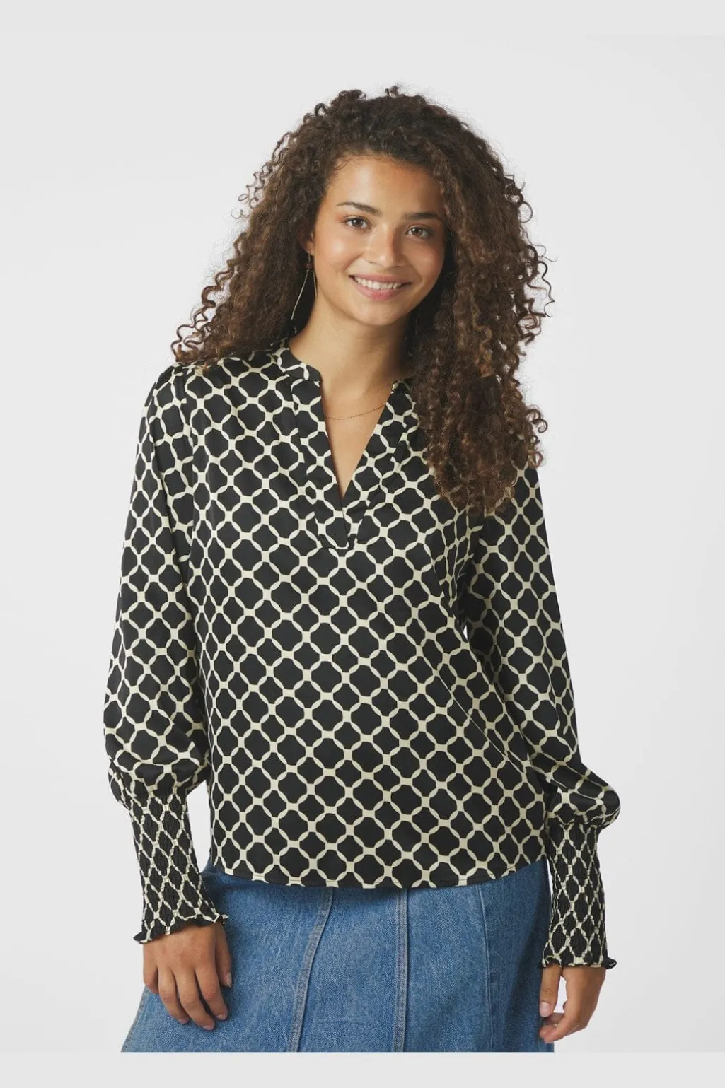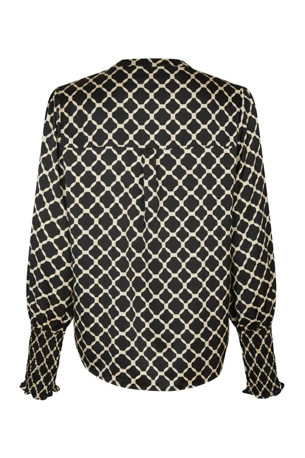 Bluse fra Neo Noir med sort og cremefarvet flisemønster. Den har en løs pasform med V-hals og lange ærmer med smockede manchetter ved håndleddene.