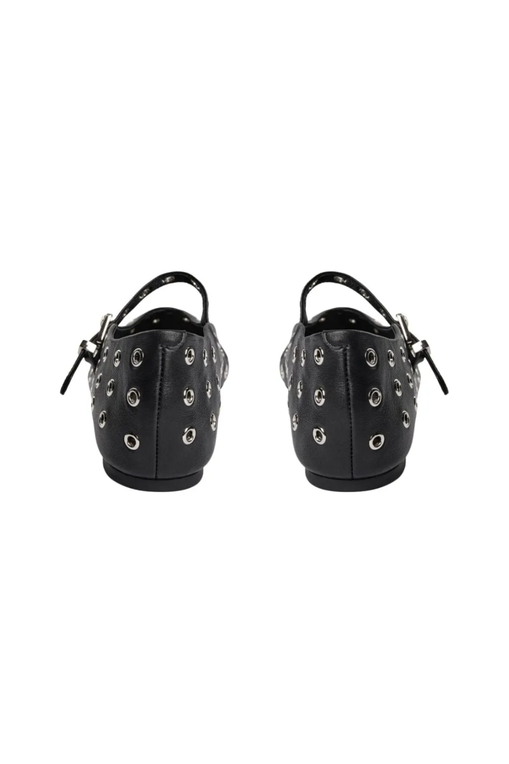 Sort ballerina-sko fra Sofie Schnoor med spids tå og metaløjer. Skoen er lavet i læder med gummisål og har en praktisk spænde-lukning.