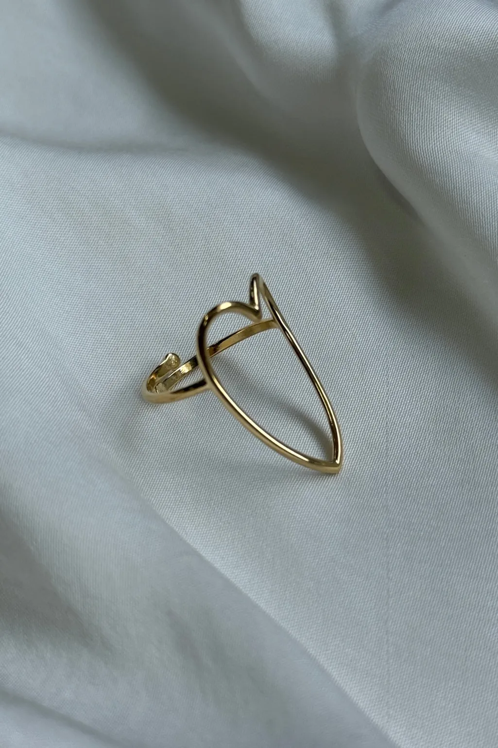 Forgyldt ring fra Mellow Moon med åbent hjerte-design. Ringen har en højde på 20 mm og er fremstillet i rustfrit stål med en gylden finish.