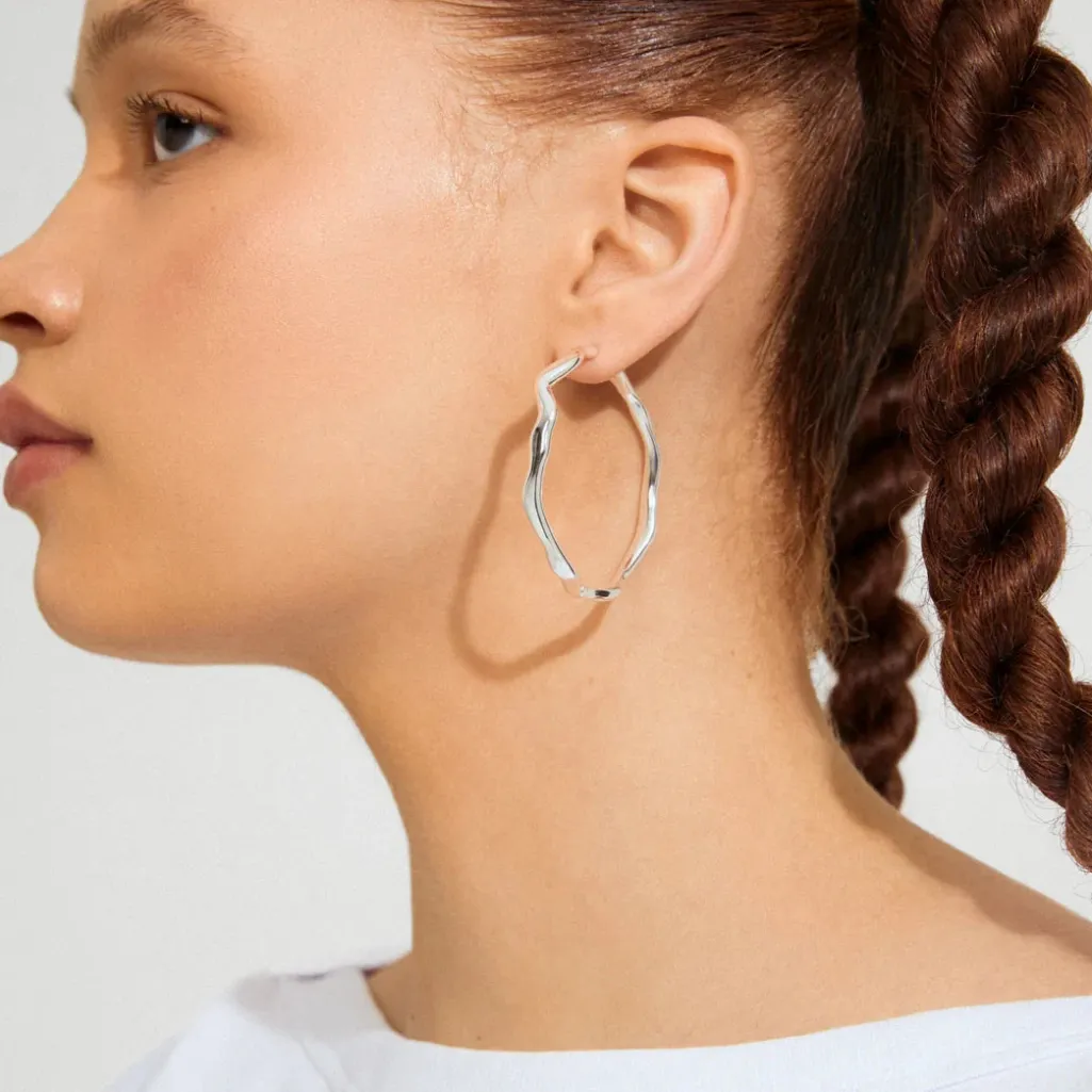 Sølvbelagte hoop-øreringe fra Pilgrim med en bølget form. Øreringene er lavet af genbrugsmaterialer og har en skinnende overflade med et organisk design.