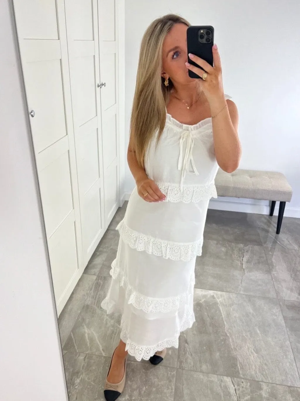 Hvid kjole fra Dear Molly med blondekanter og lag-på-lag-design. Kjolen har stropper og en blød pasform med fire vandrette blondelag fra taljen og ned.