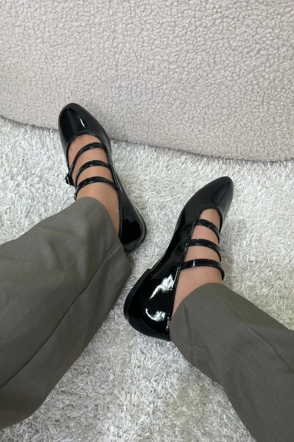Sort lakerede sko med tre spænder fra Bloom. Den spidse tå og de smalle remme giver skoen et klassisk udtryk, der passer til både festlige og formelle anledninger.