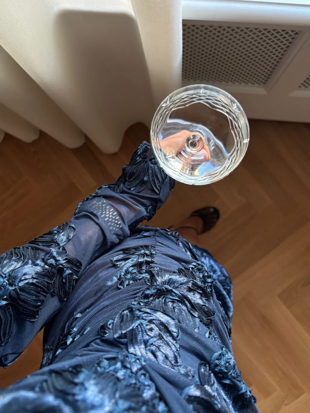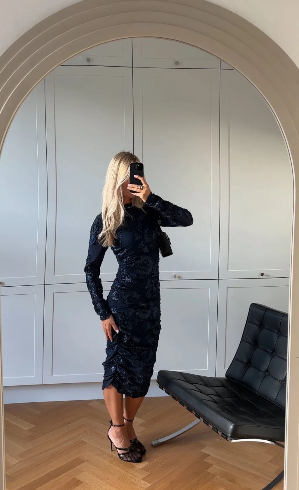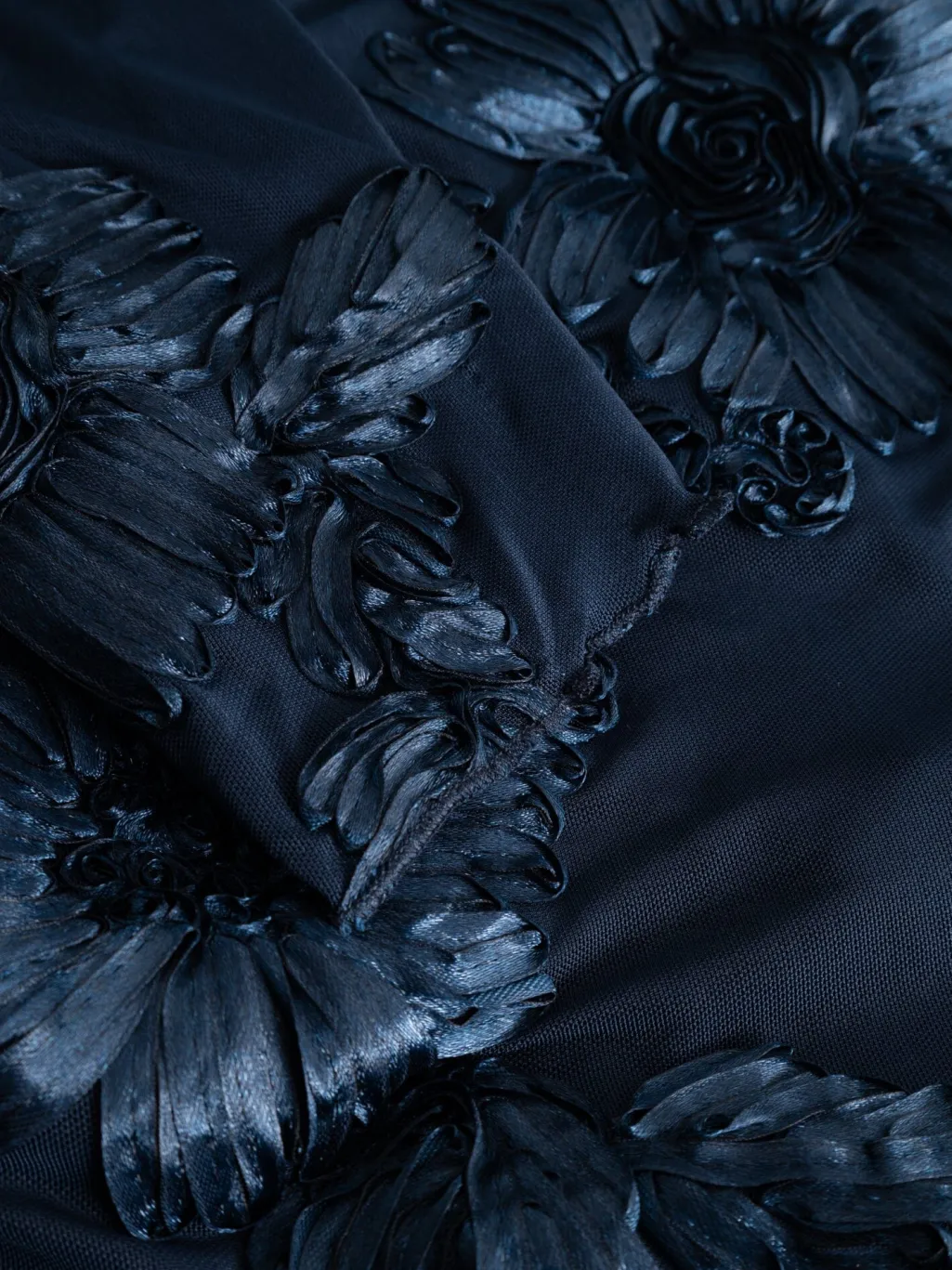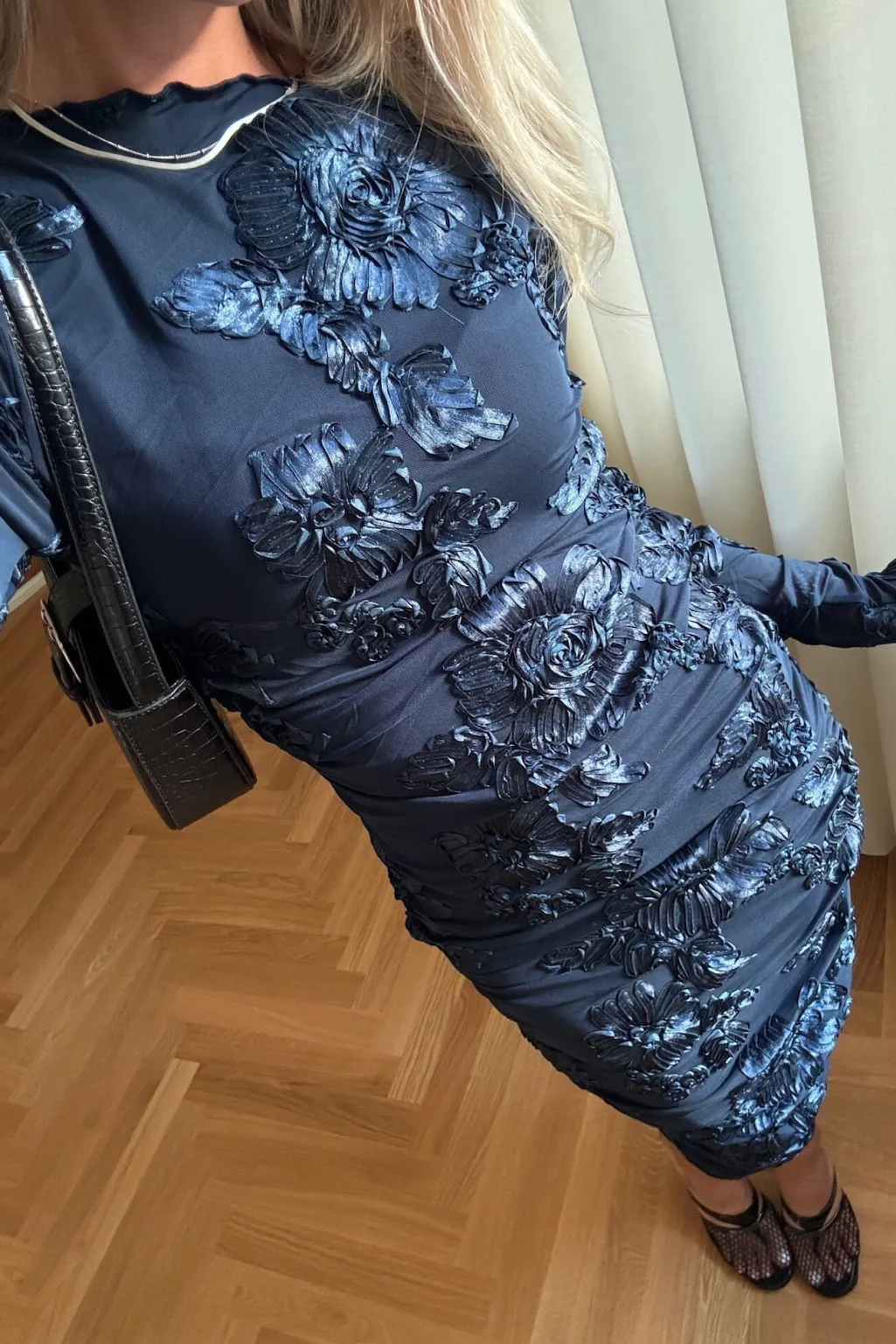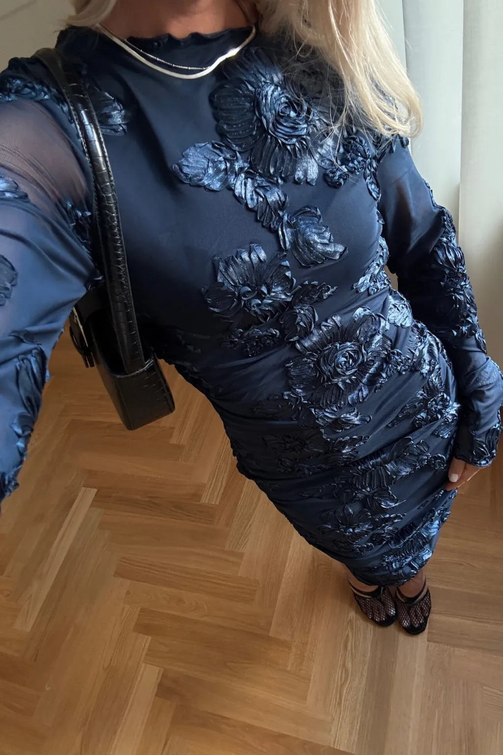 Mørkeblå kjole fra Noella med 3D-blomstermønster. Kjolen har en kropsnær pasform og lange ærmer. Strækbart meshstof med broderi og flæser giver kjolen et særpræget udtryk.