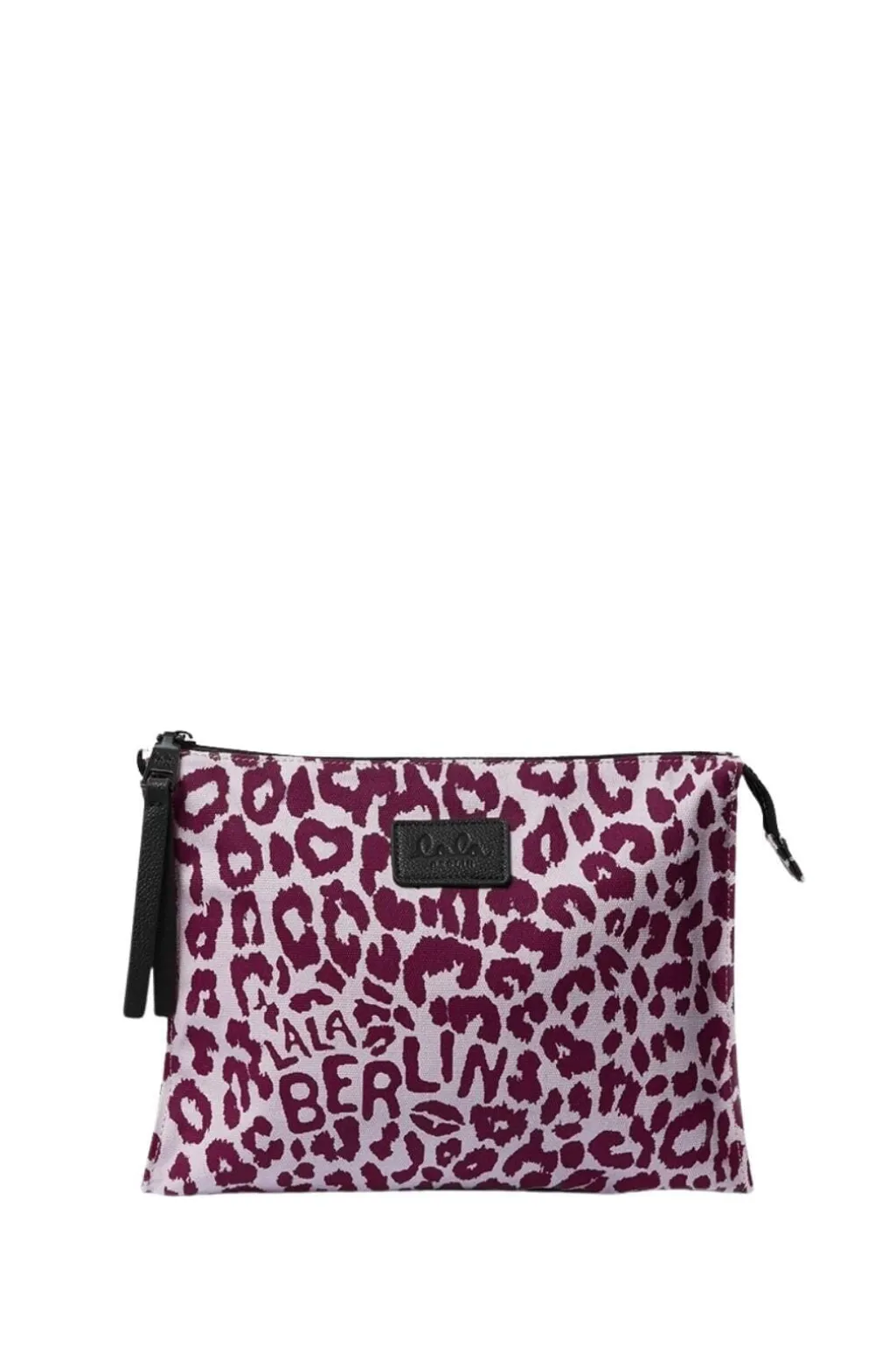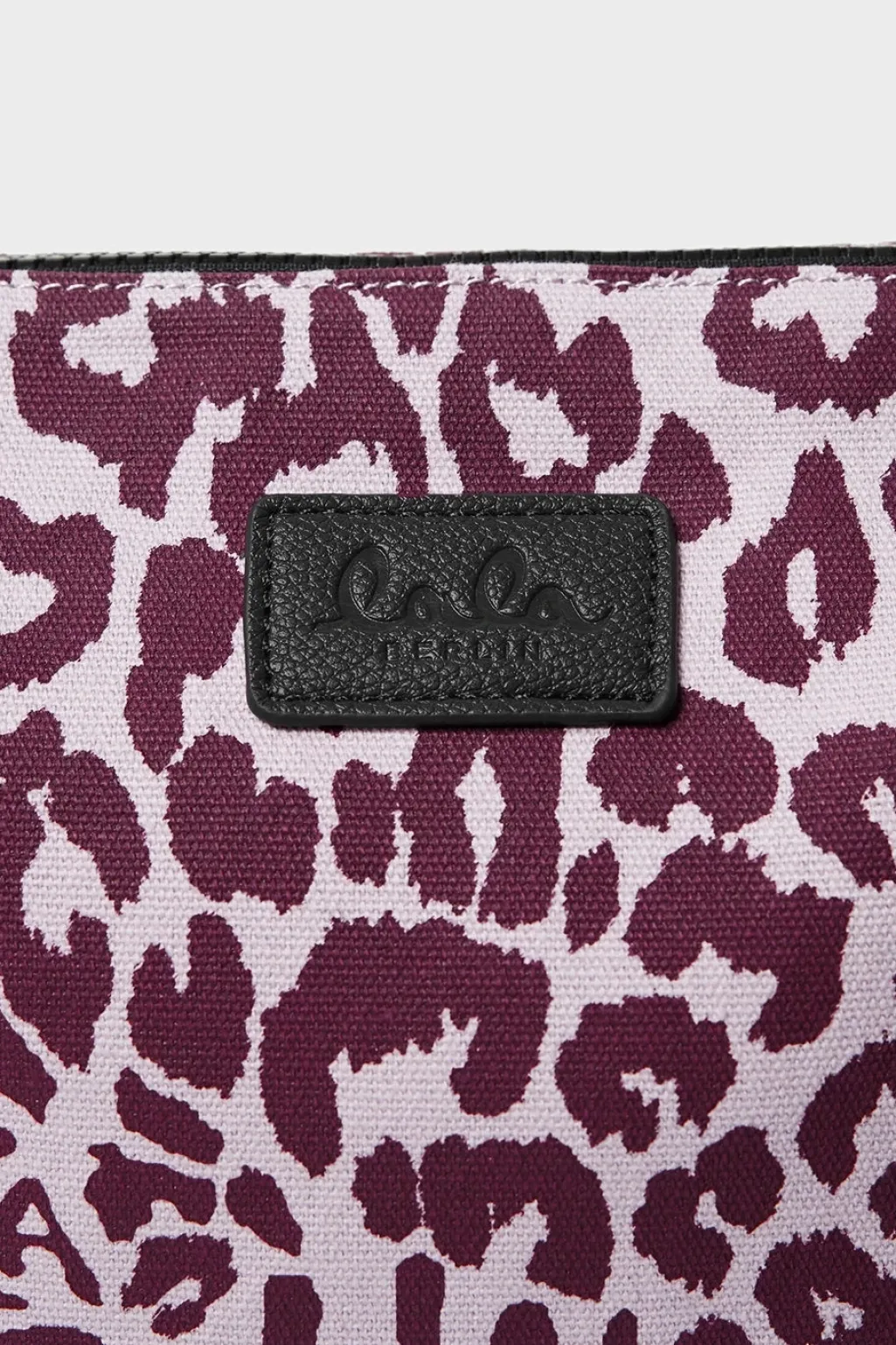 Pung fra Lala Berlin i canvas med et leopardmønster i bordeaux og røde nuancer. Mønsteret er trykt på en lys bund.