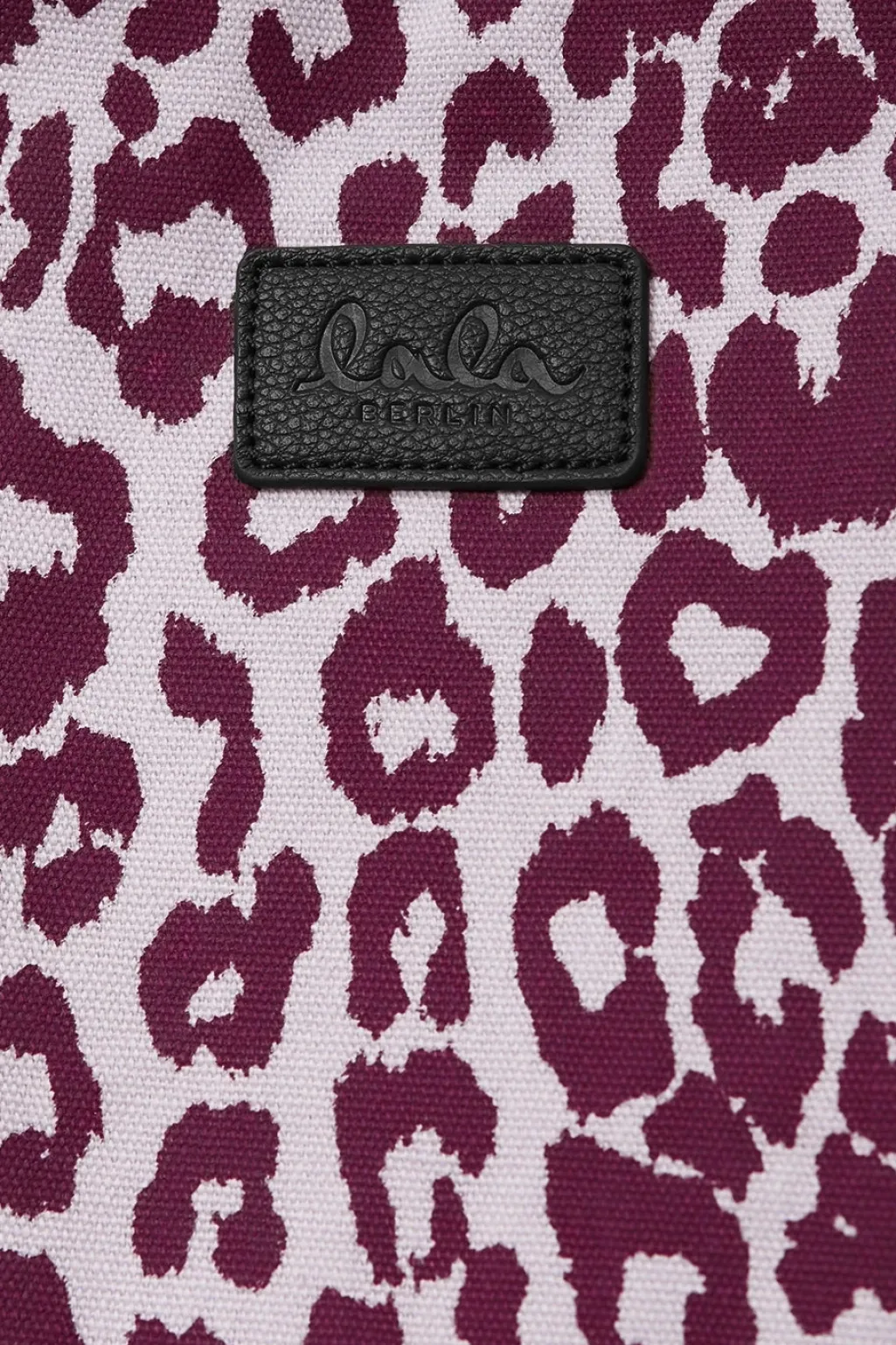 Tote bag fra Lala Berlin, lavet af trykt canvas med et leopardmønster i burgunder, lyserød og røde nuancer.