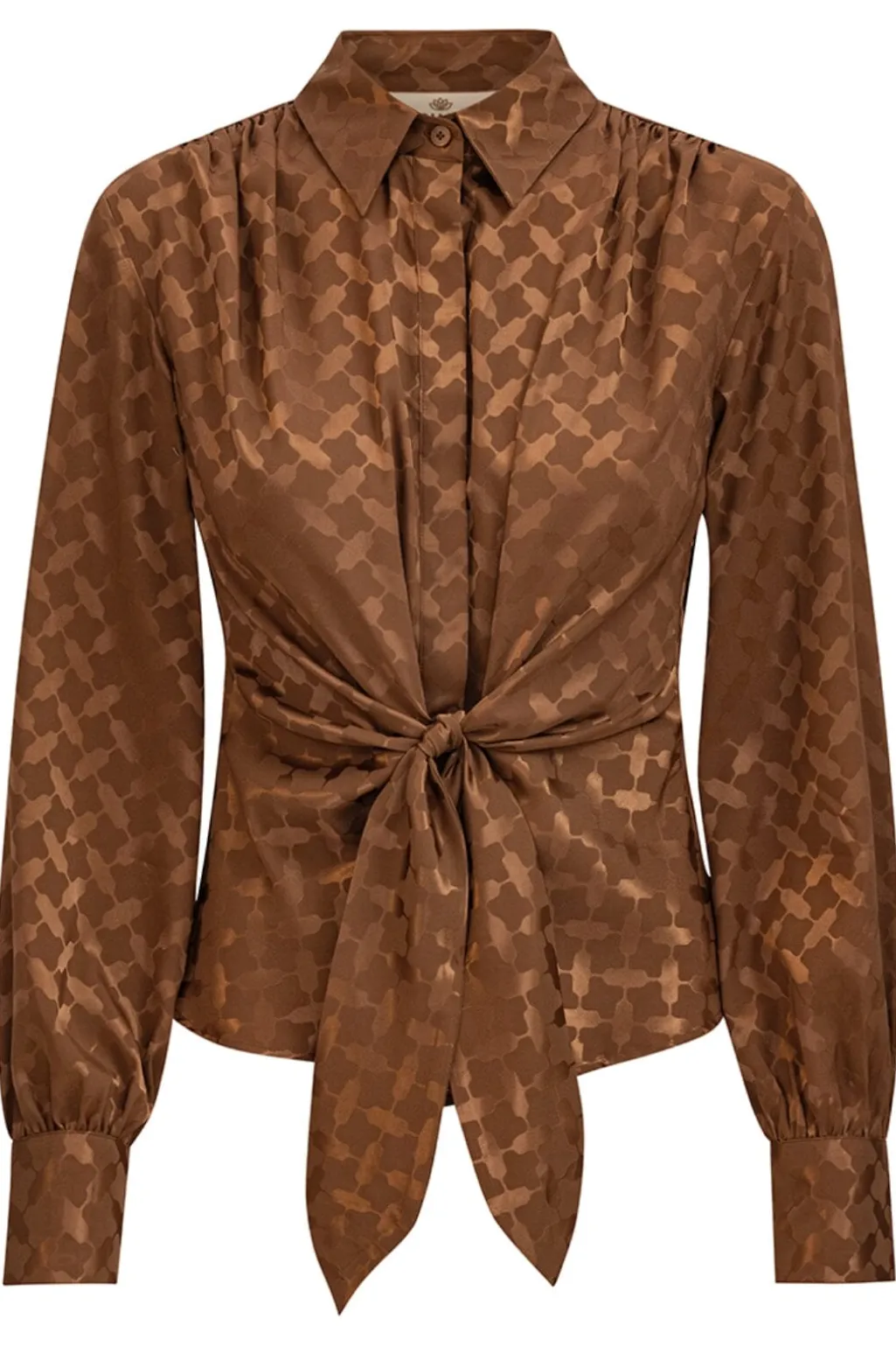 Brun skjorte fra Karmamia med jacquardmønster. Skjorten har bindebånd i taljen og lange ærmer med knapper ved manchetterne.